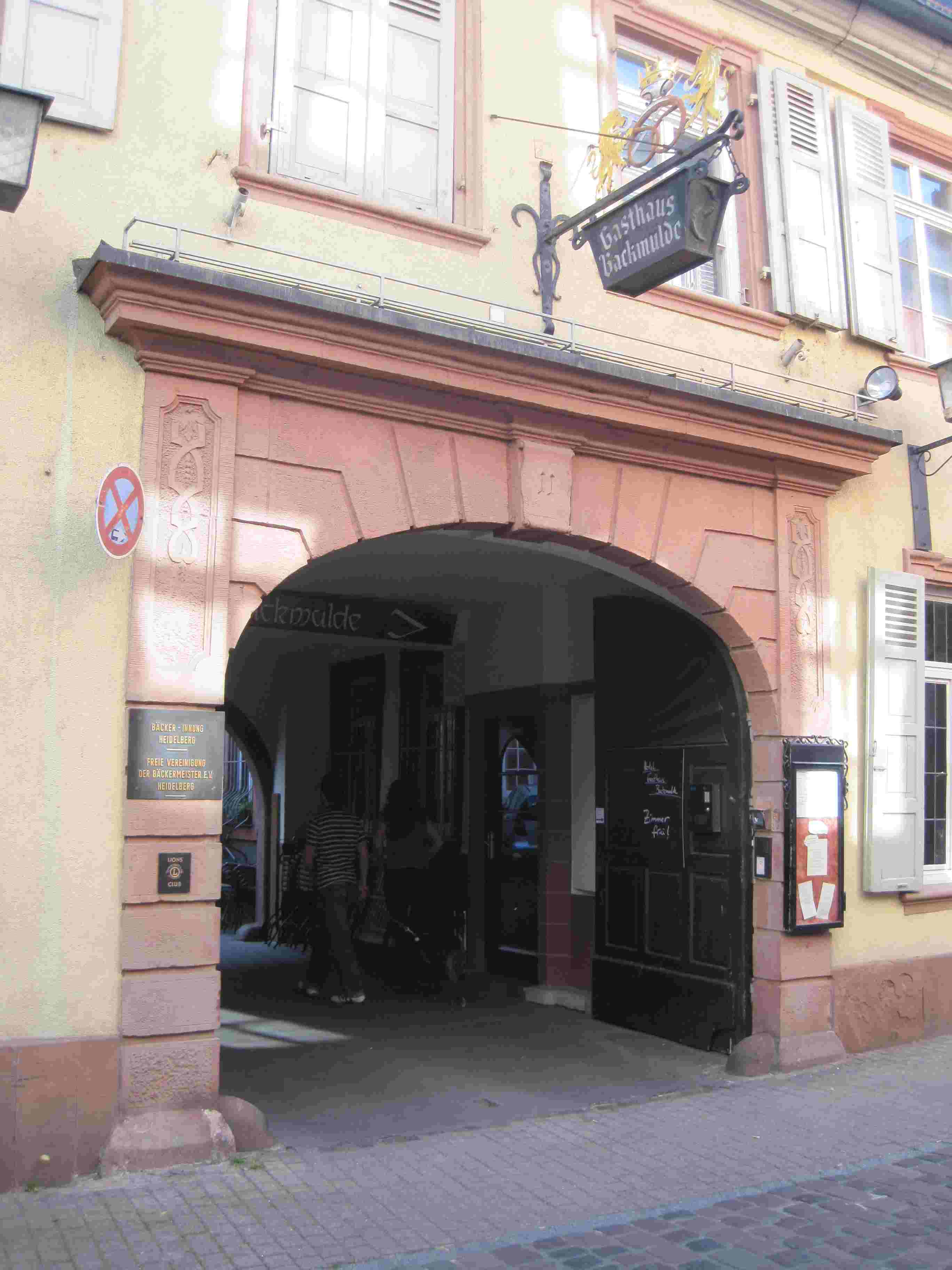 Backmulde (Schiffgasse 11, früher „Schwarzes Schiff“, 1698 wiederaufgebaut, am 19. April 1927 eingeweiht, Innungshaus der Bäcker, vor 1945 Fremdarbeiterlager); vgl. Karl Christ, Zur Einweihung der „Backmulde“, in: Heidelberger Tageblatt Nr. 87, 13. April 1927, S. 5)