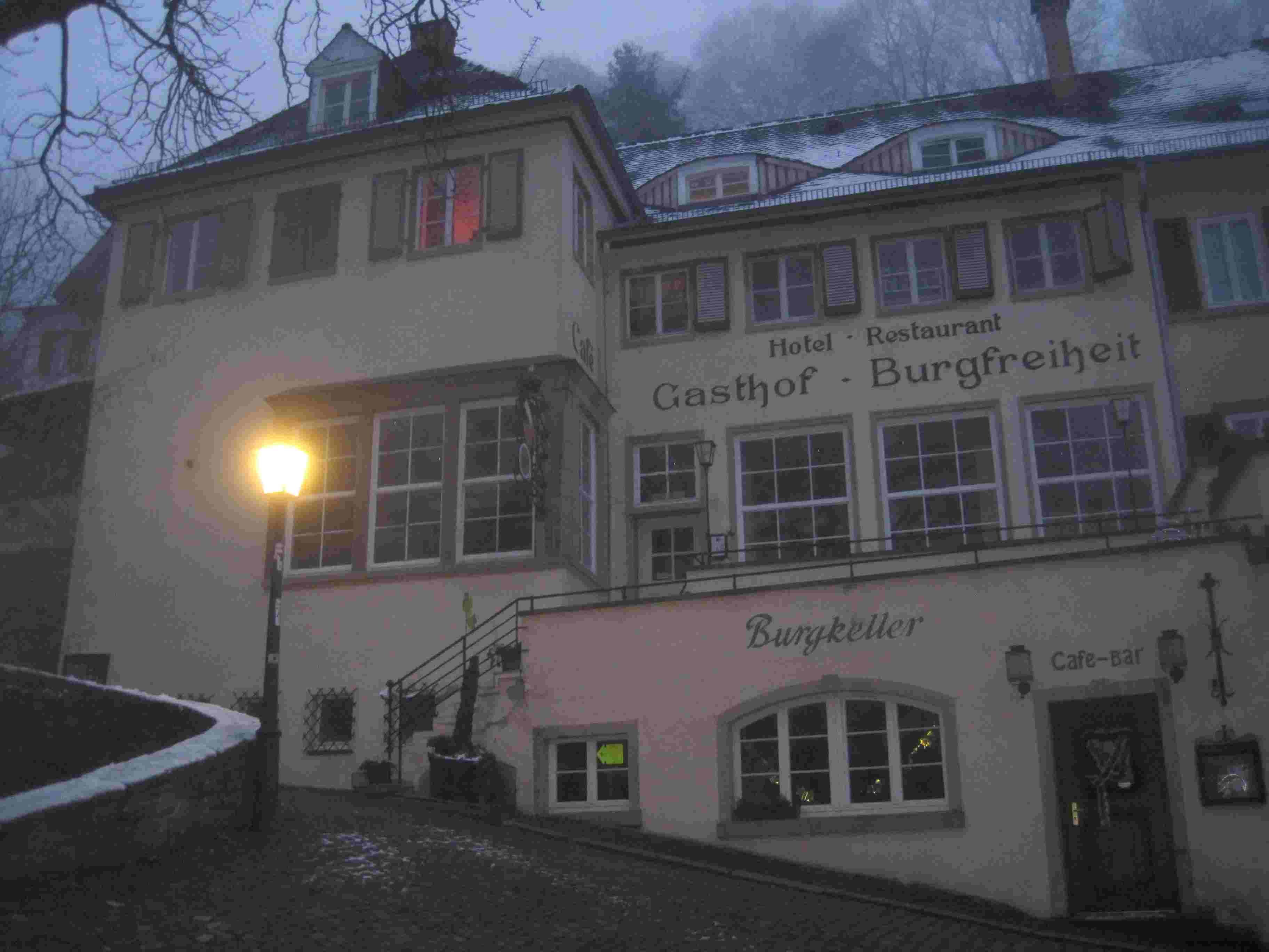 Burgfreiheit (Neue Schloßstraße 52, Wirte: 1897-1900 Josef Steubing Wtw., 1900-17 Georg Jäger, 1918-19 Anna Hoffmann, 1920-29 Adam Hoffmann, 1930-31 Neubau, 1931-33 Otto Lebau, 1934-58 Rudi Schmidt. (Karl Christ, Alt-Heidelberger Wirtschaften. 1925, S. 15; Heidelberger Fremdenblatt 1934, S. 23). Name nach der privilegierten Gerichtsverfassung der Schloßberg-Gemeinde)