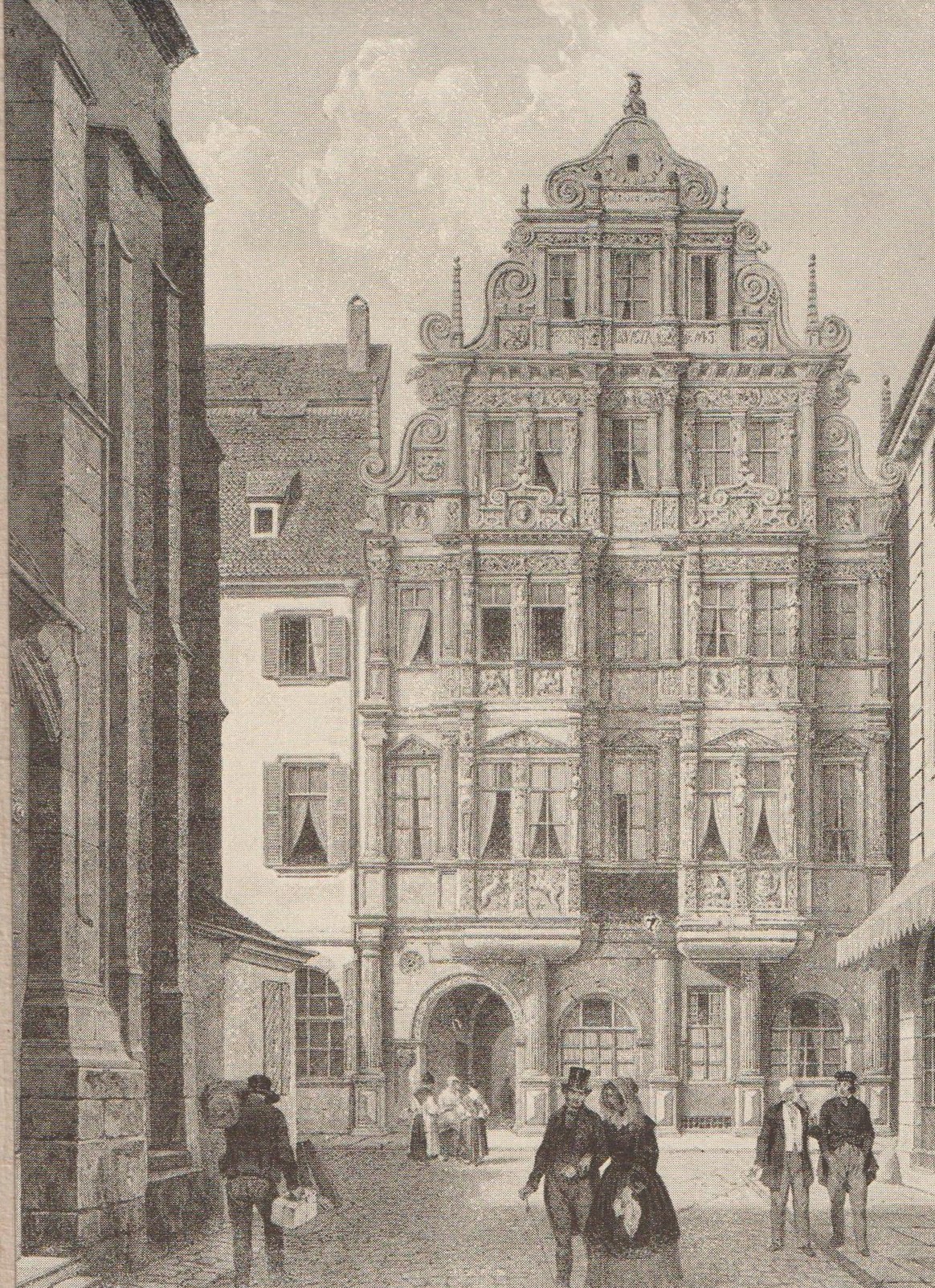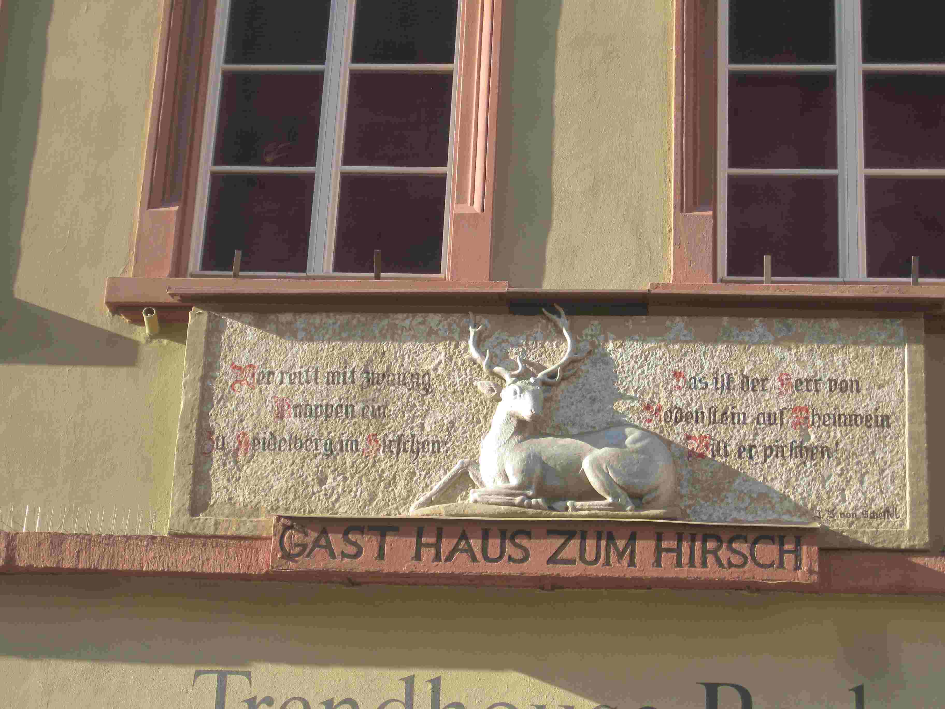 *Goldener Hirsch, Gasthaus (Markplatz/Hirschstraße 2; Schützendorfsches Haus, 1490 erstmals erwähnt, 1544 im Zinsbuch des Augustinerklosters erwähnt. Wirt: 1583 Heinrich Eckart/Eckhardt (†1605), Bürgermeister. Bis 1809 Dechanei (katholisches Stadtpfarrhaus)?. 1863/1867 kauft die Stadt Heidelberg das ehemalige Gasthaus an, es wird ab 1871 teilweise der Städtischen Sparkasse vermietet; 1884 Brand im Rathaus, die Sparkasse räumt das Haus; 1887/88 zerstört; die Schildgerechtigkeit geht auf das Eckhaus am Wredeplatz (später AOK) über (vgl. N.A. I, S. 189, II, S.56 Nr.132, S.58 Nr.144, VIII S. 61; Derwein 1940, Nr. 329; Ludwig Haßlinger, Stadteilverein Handschuhsheim, Jahrbuch 2004 S. 87 ff.). - Ludwig Haßlinger schreibt: "„Zum Hirschen“ ("uffm Markt“, Ecke Hirschstraße. "Der Hirsch uffm Markt" wird 1546 in einem Zinsbuch des Augustinerklosters erwähnt. Die Hirschstraße wurde nach dem Gasthaus benannt. Der Heidelberger Bürgermeister Heinrich Eckart/Eckhardt war um 1580 Gastwirt auf dem Hirschen. Er legte 1583 in der Ziegelhäuser Landstraße einen Garten mit Lusthaus und Fischweiher an, das er nach seinem Gasthaus, „Zum Hirsch“ nannte. Aus dieser Anlage entstand die Gastwirtschaft „Zum Hirschen“ mit dem Beinamen „Kuchenhäuschen“. Das Gasthaus wurde bis 1895 betrieben. An Stelle des 1902/03 abgebrochenen Gasthauses wurde die Villa Cuntz, Ziegelhäser Landstraße 37, erbaut. - 1683/84 wird Georg Lang als Gastwirt auf dem Hirschen (am Markt) erwähnt. Das Gasthaus am Marktplatz war öfters Absteige des Götz von Berlichingen bei seinen Besuchen in Heidelberg. Philipp Melanchthon, der auf Einladung des Kurfürsten Otto Heinrich nach Heidelberg kam, logierte im Oktober 1557 im Hirschen. Victor von Scheffel läßt in seinem Gedicht den Herrn von Rodenstein im Hirschen einkehren. („Wer reit‘ mit zwanzig Knappen ein, zu Heidelberg im Hirschen? das ist der Herr von Rodenstein, nach Rheinwein will er pirschen“). Wie aus einem Brief von Pfalzgräfin Elisabeth Charlotte zu erfahren ist, war der Hirsch der vornehmste Gasthof in der Stadt. Sie schrieb 1722 an ihre „herzallerliebste Luise“ „Ist das Wirtshaus vom großen Hirsch noch auf dem großen Markt? Das war doch das Wirtshaus, so in der größten Reputation war“. Das Gasthaus wurde beim Stadtbrand 1693 vernichtet. Das von 1701 bis 1705 im barocken Baustil neu errichtete Haus war um 1800 katholisches Stadtpfarrhaus. Ab wann es wieder als Gasthaus betrieben wurde läßt sich nicht genau feststellen. Vor 1829 betrieb Johann David Weber den „Goldenen Hirsch“, wie aus dem Gesuch des Medizinalrats Dr. Piffikus Zipf zu ersehen ist. Am 27. Mai 1834 beantragte er die Gerechtigkeit zur Wiedereröffnung des von Johann David Weber für 5 Jahre geschlossenen Gasthofs zum goldenen Hirsch. Die Konzession zur Weiterführung des Gasthauses wurde ihm am 25. Oktober. 1836 erteilt. Dr. Pfiffikus Zipf hat den Goldenen Hirsch nur kurze Zeit betrieben. Seine Witwe wohnte von 1839-1855 in dem Gasthaus. Die Gastwirtschaft wurde in dieser Zeit nicht betrieben, wie aus den Adreßbüchern ersichtlich. Im Jahr 1856 hat David Weber den Gasthof wieder eröffnet. Ihm folgte 1857-58 Karl Peter Geierhaas. Der letzte Gastwirt auf dem Goldenen Hirsch war 1860 Johann Peter Jungmann. Im Jahr 1867 erwarb die Stadt Heidelberg. das Gasthaus für 35000 Gulden. Von 1871 bis 1884 diente es der Städtischen Sparkasse als Domizil. 1885 wurde das alte Gasthaus abgebrochen, es mußte dem 1886/87 errichteten Rathaus-Nordflügel weichen. [N.A ,I, S.189, II, S.56 32, S.58, Nr.144, VIII, S.61], (HDwfw S.39), (Adressbuch ab 1839, 1860 letzter Eintrag) (Karl Christ, Alt-Heidelberger Wirtschaften. 1925, S. 4f.)