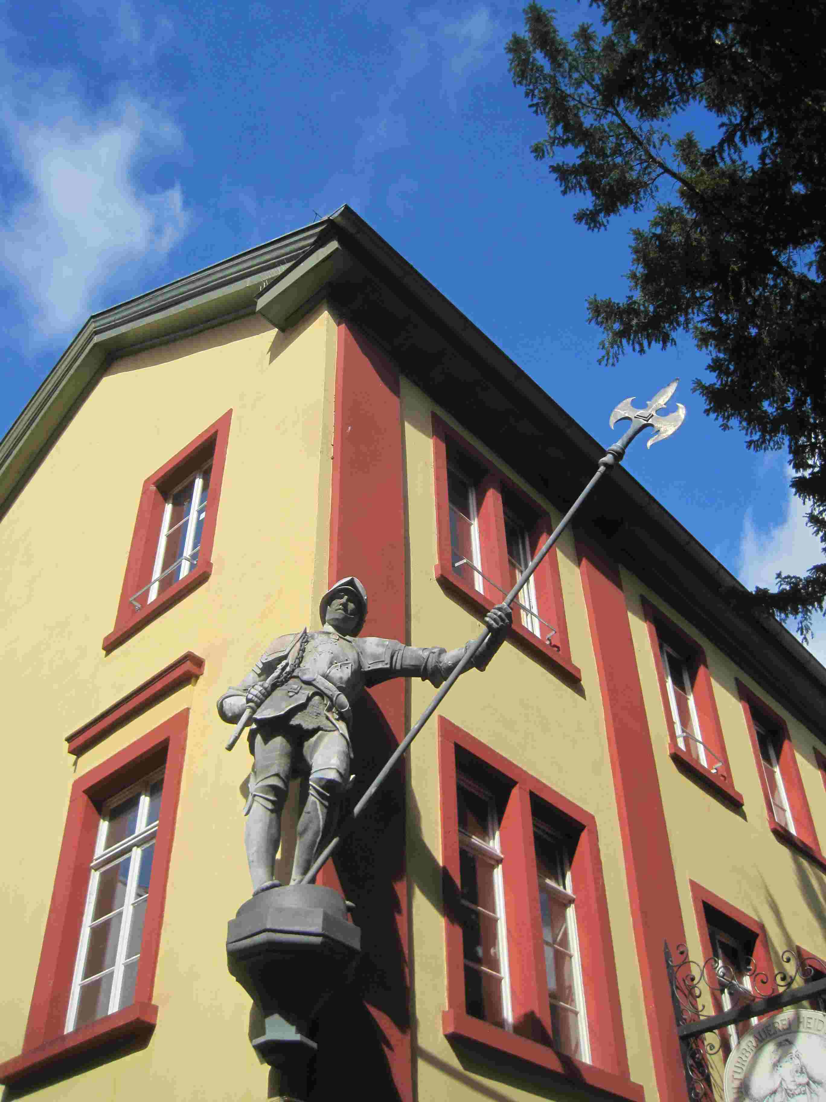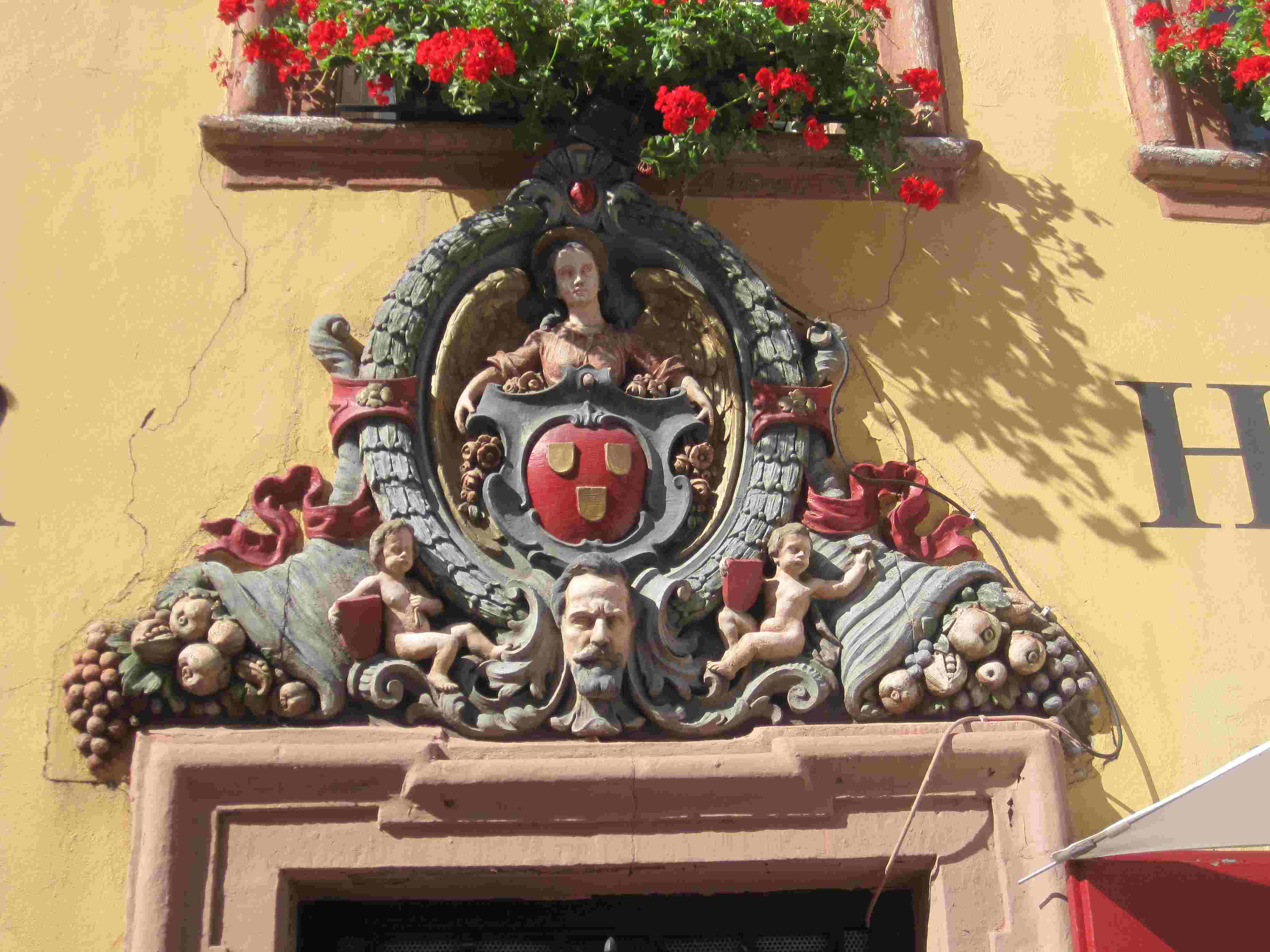 Ritter, Haus zum Ritter St. Georg (Hauptstraße, 1592 durch den Kaufmann (Tuchhändler) Charles Belier aus Tournai (Doornik/Tournay/Hennegau (†1618) als Wohnhaus erbaut, seit Ende des 17. Jahrhunderts Gasthaus, 1904 renoviert. Der Ritter am rechten Hauserker ist Pfalzgraf Johann Casimir, die Edelfrau mit Falken daneben Pfalzgräfin Elisabeth von Sachsen (vgl. Hans-Martin Mumm, Der Ritter am ,Ritter' und seine Frau. Ein neuer Blick auf eine berühmte Fassade, in: Heidelberg. Jahrbuch zur Geschichte der Stadt, herausgegeben vom Heidelberger Geschichtsverein, Nr. X (2005/2006), S. 151ff.)