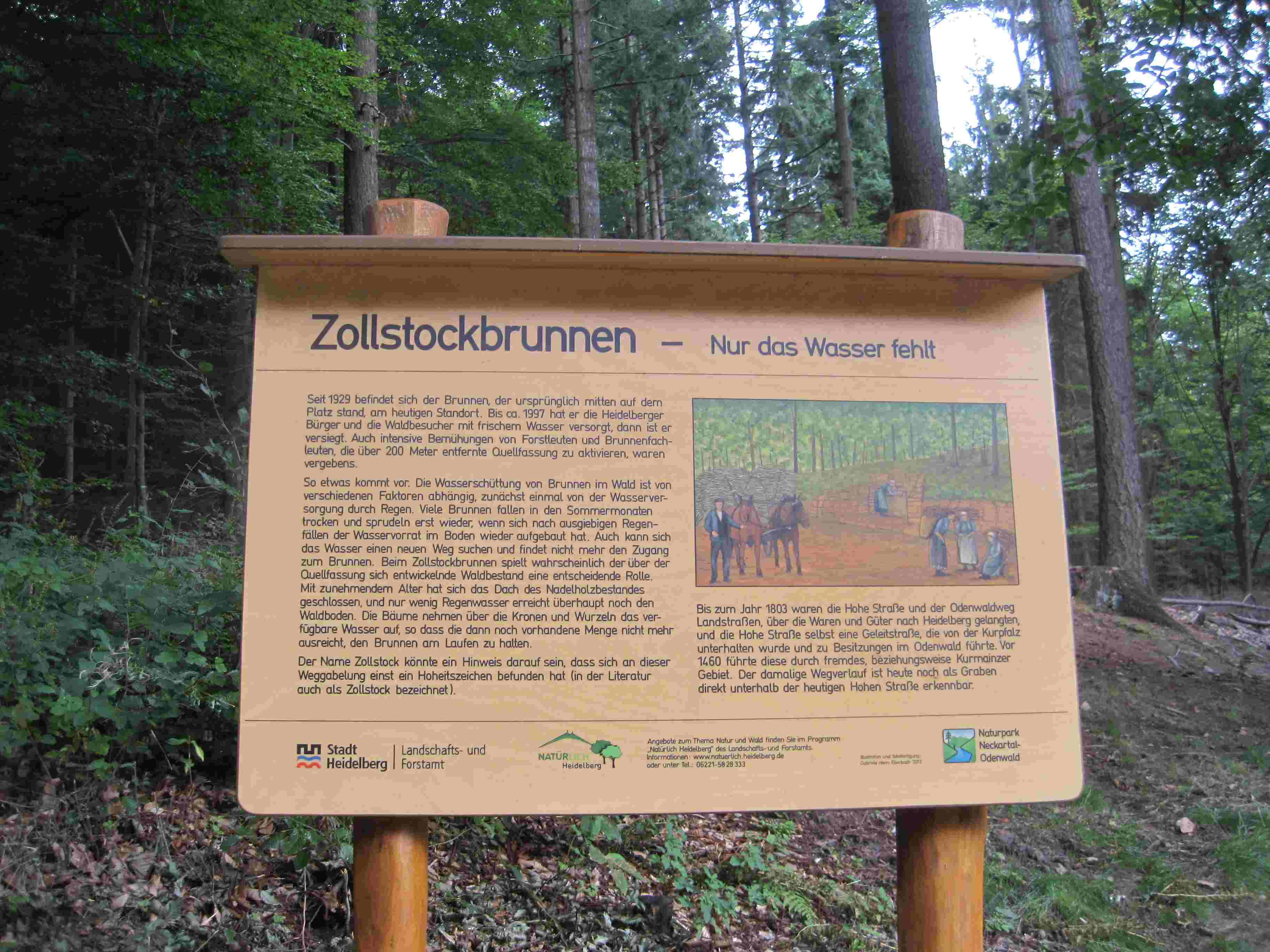 Landfriedbrunnen (Heiligenberg, Zollstockbrunnen, an der Zollstockhütte, 1894 von Fabrikant F. Landfried jun. auf seine Kosten angebracht, 1929 auf den heutigen Standort versetzt, bis 1997 Schüttung, heute versiegt; vgl. Plan der Heidelberger Stadtwaldungen nach dem Stand von 1902 auf Grund des städtischen Planmaterials hg. von Otto Petters, 3. Aufl., Maßstab 1:16.000 (Verlag von Otto Petters). Heidelberg [1902])