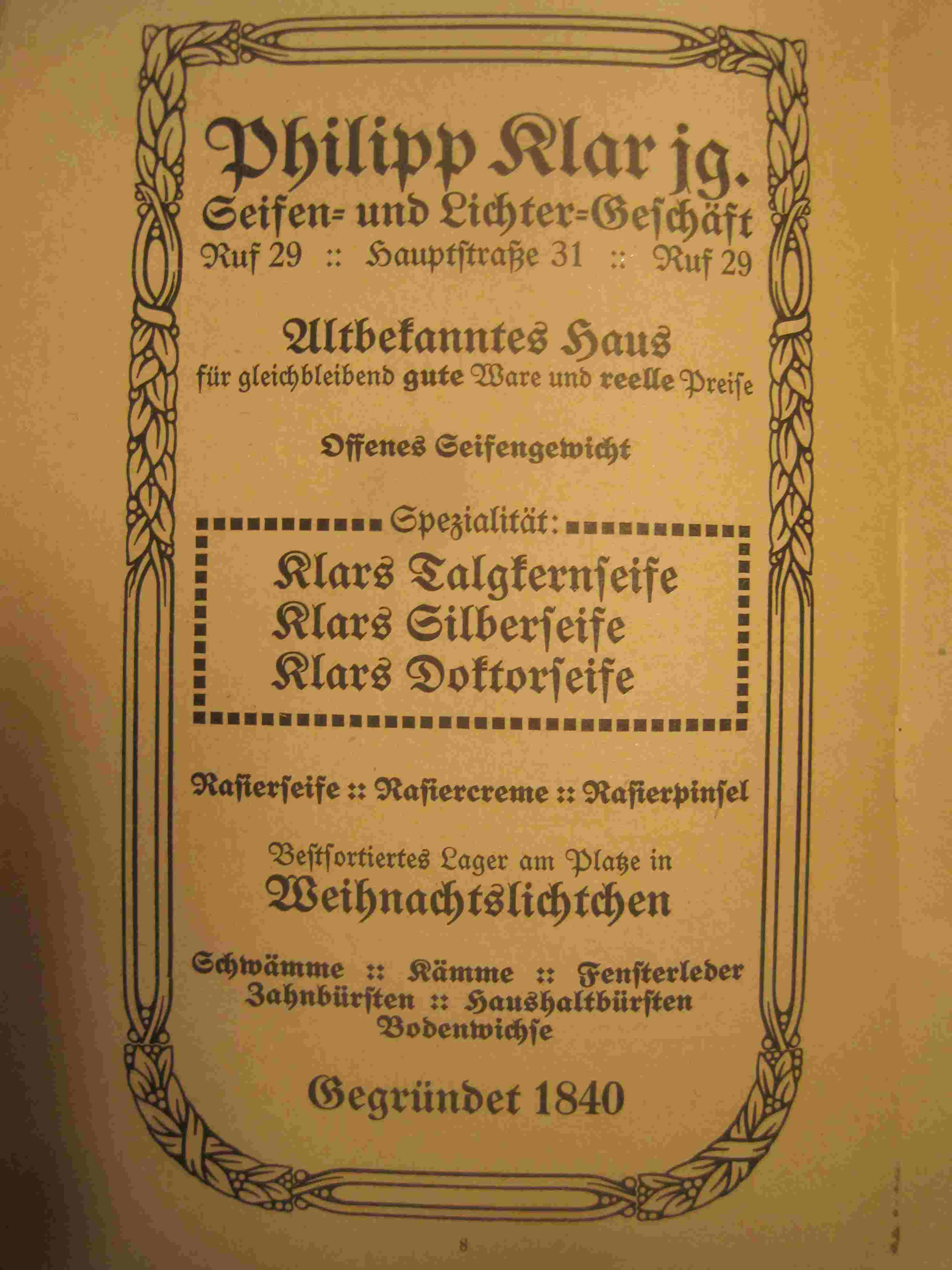 Inhaber: Philipp Werner; Geschäftshaus: Eckhaus Hauptstraße 76, Märzgasse 1 (1910/11 erbaut)