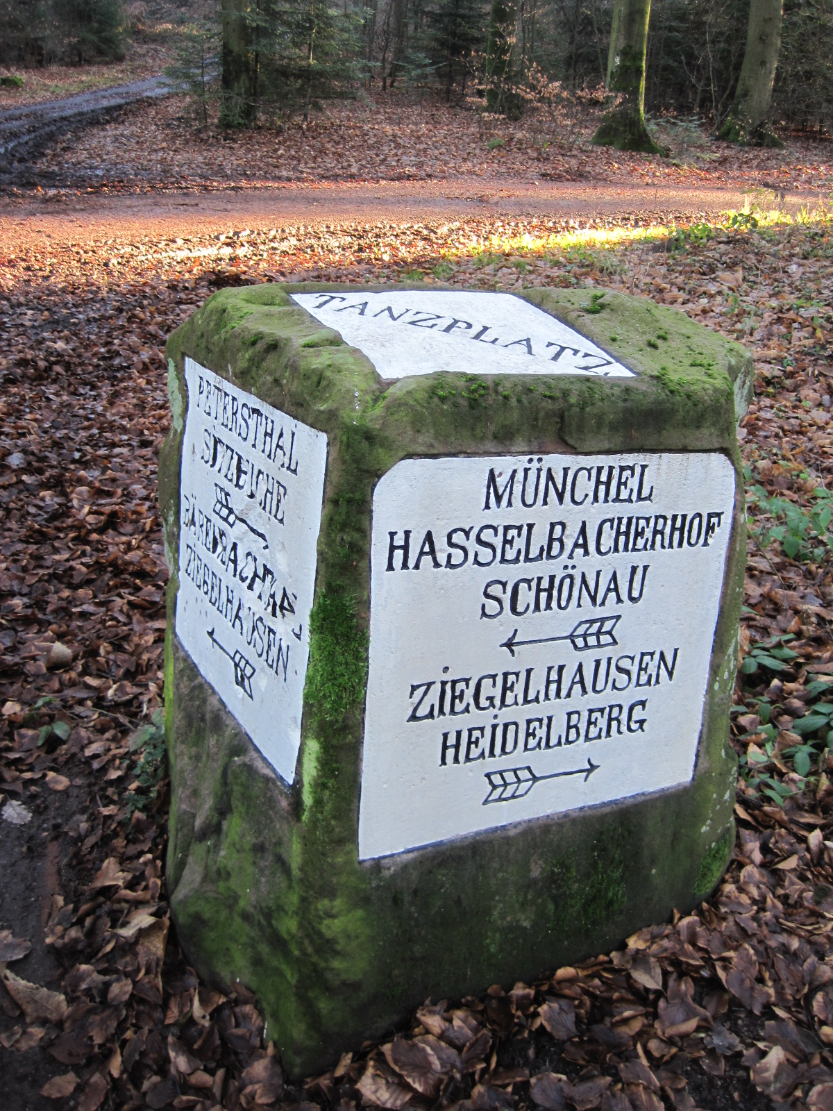 Zollstock (Landmarke, Wegkreuzung, 382 Meter über NN; 1609 erwähnt) Vielleicht stand hier ein Pfahl mit dem kurpfälzer Wappen als Hinweis auf die kurpfälzische Landstraße („Hohe Straße“), die durch den Allmendwald und durch Kurmainzer Herrschaftsgebiet zog. (vgl. Fritz Frey, Die Flurnamen von Handschuhsheim. Heidelberg 1944, Nr. 523) (Auch der Tanzplatz bei Ziegelhausen hieß früher Bild- oder Zollstock)