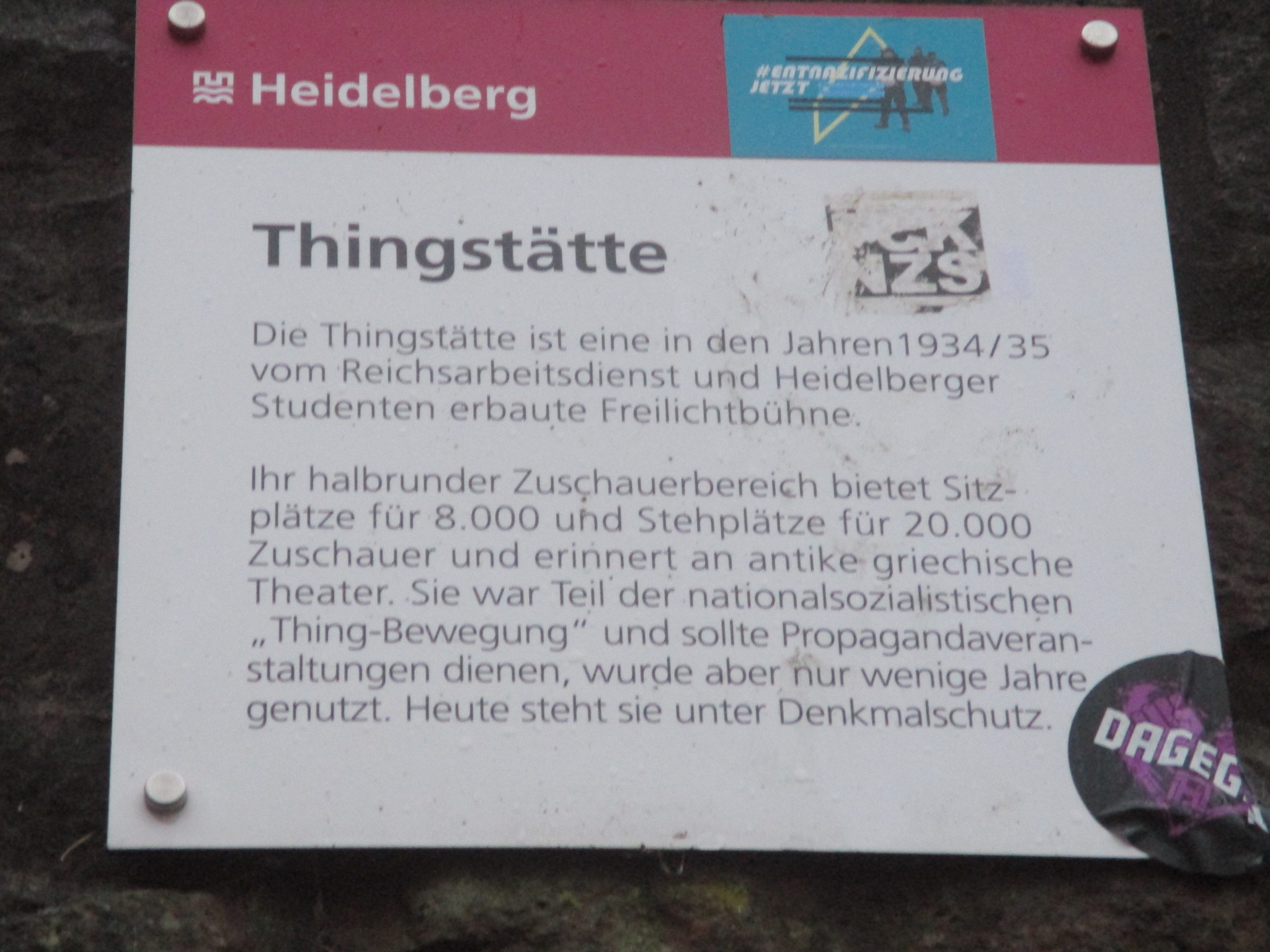 Feierstätte der Volksgemeinschaft, Thingstätte (Heiligenberg; 30. Mai 1934: Grundsteinlegung, 26. Januar 1935: Richtfest der Hochbauten; 22. Juni 1935: Einweihung der unter dem Namen „Feierstätte Heiligenberg“ mit Sonnwendfeier in Anwesenheit von RM Dr. Joseph Goebbels; Architekt: Hermann Alker; nach 1945: „Heiligenberg-Anlage“, vulgo „Thingstätte“) (vgl. Fritz Frey, Die Flurnamen von Handschuhsheim. Heidelberg 1944, Nr. 107)