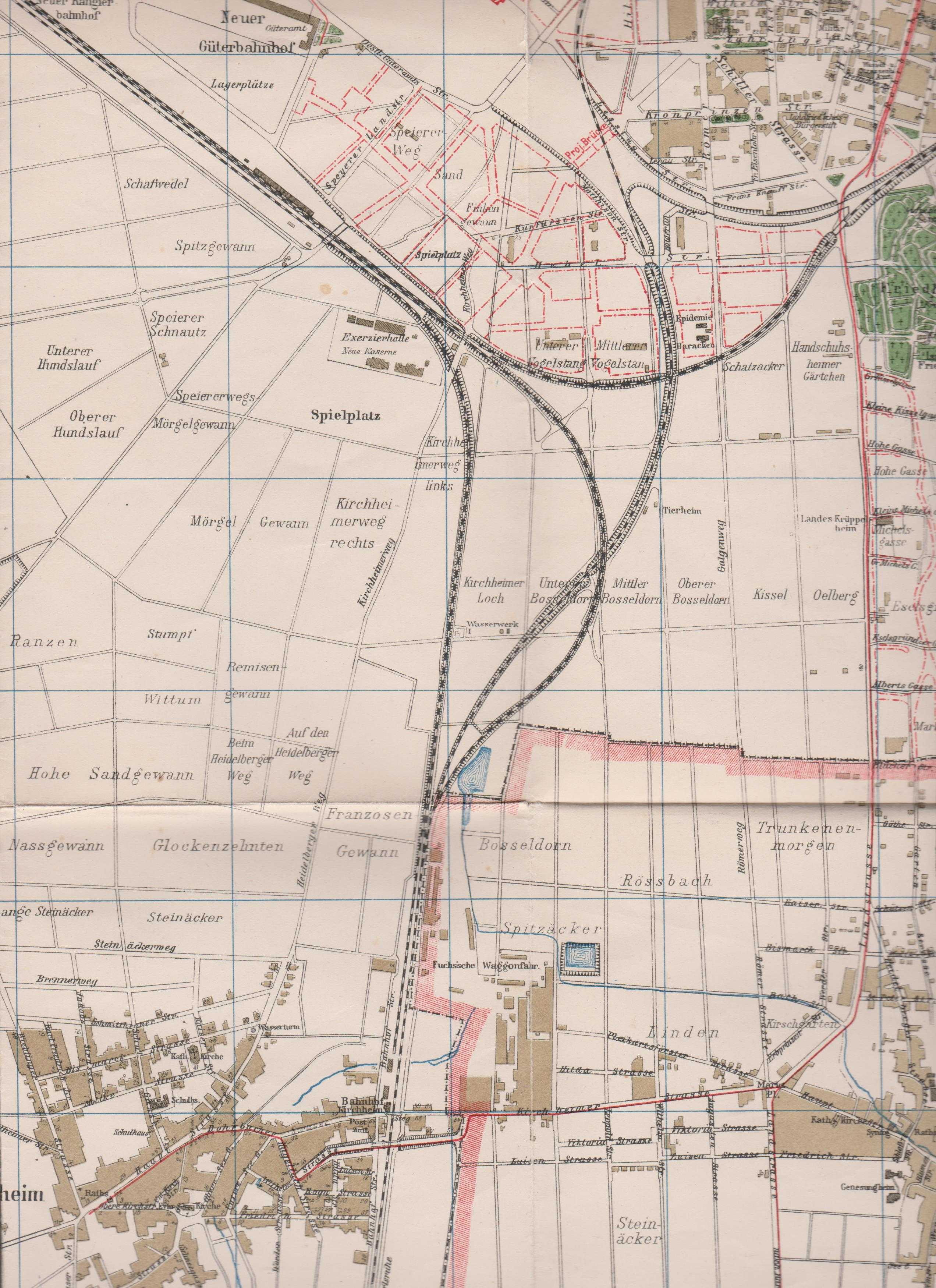 *Entenpfühler Weg (Pfad durch das Gewann Entenpfuhl, d. h. etwa zwischen heutiger Bahnhofstraße, Blumenstraße, Kleinschmidtstraße, Landhausstraße; mündet im Osten in den Kirchheimer Weg; vgl. Derwein 1940, Nr. 154f.; vgl. Seelenweg)