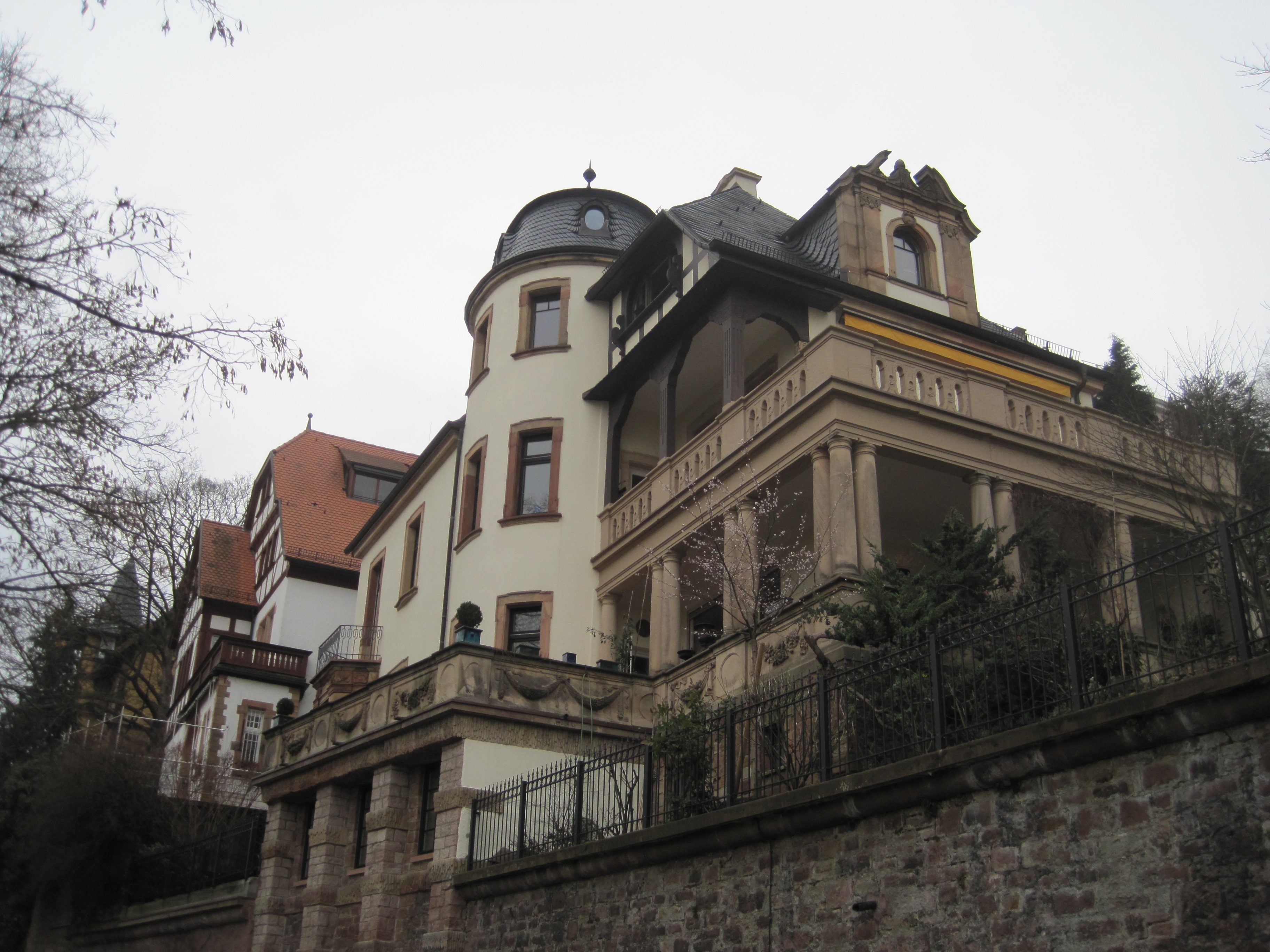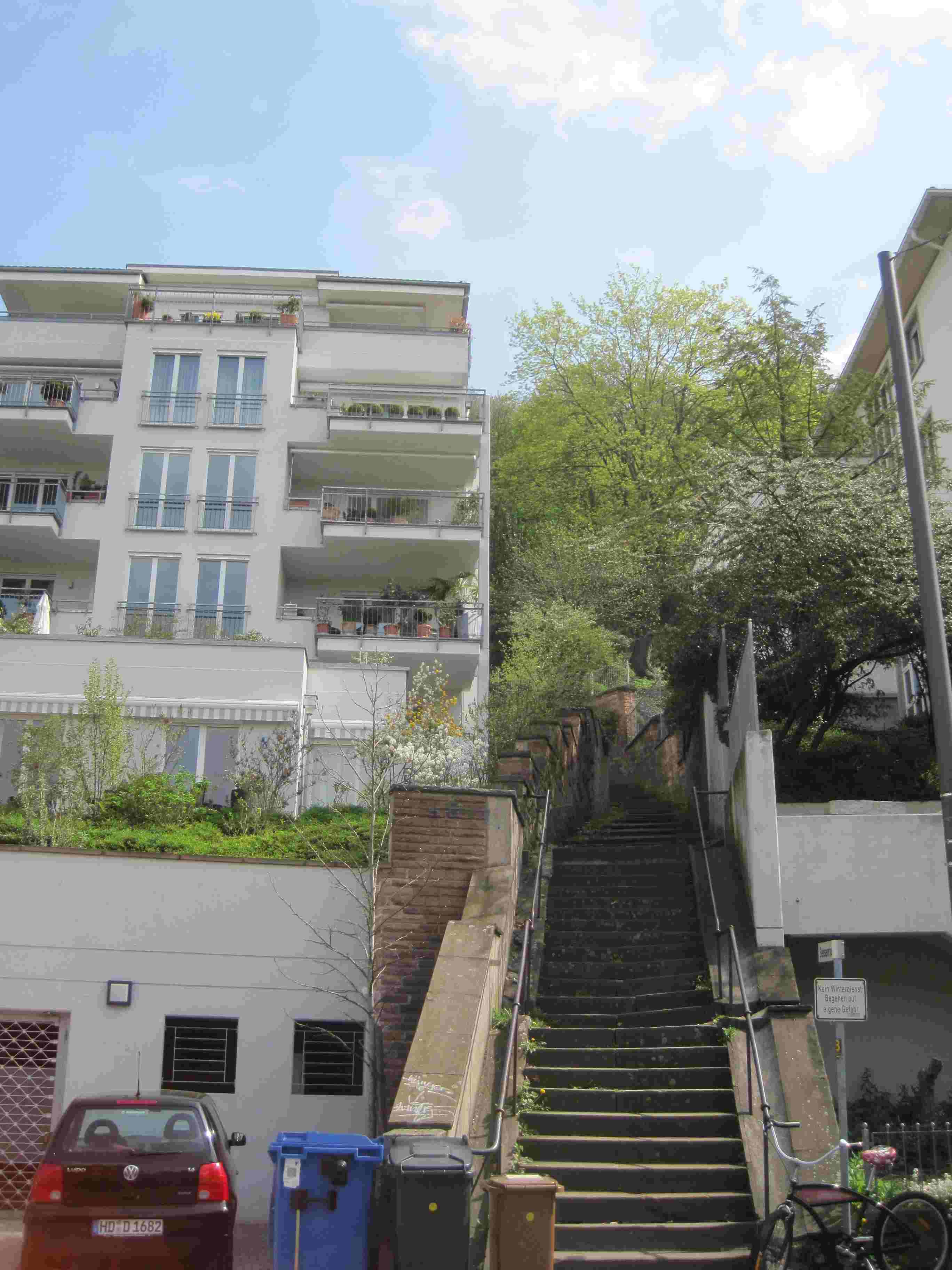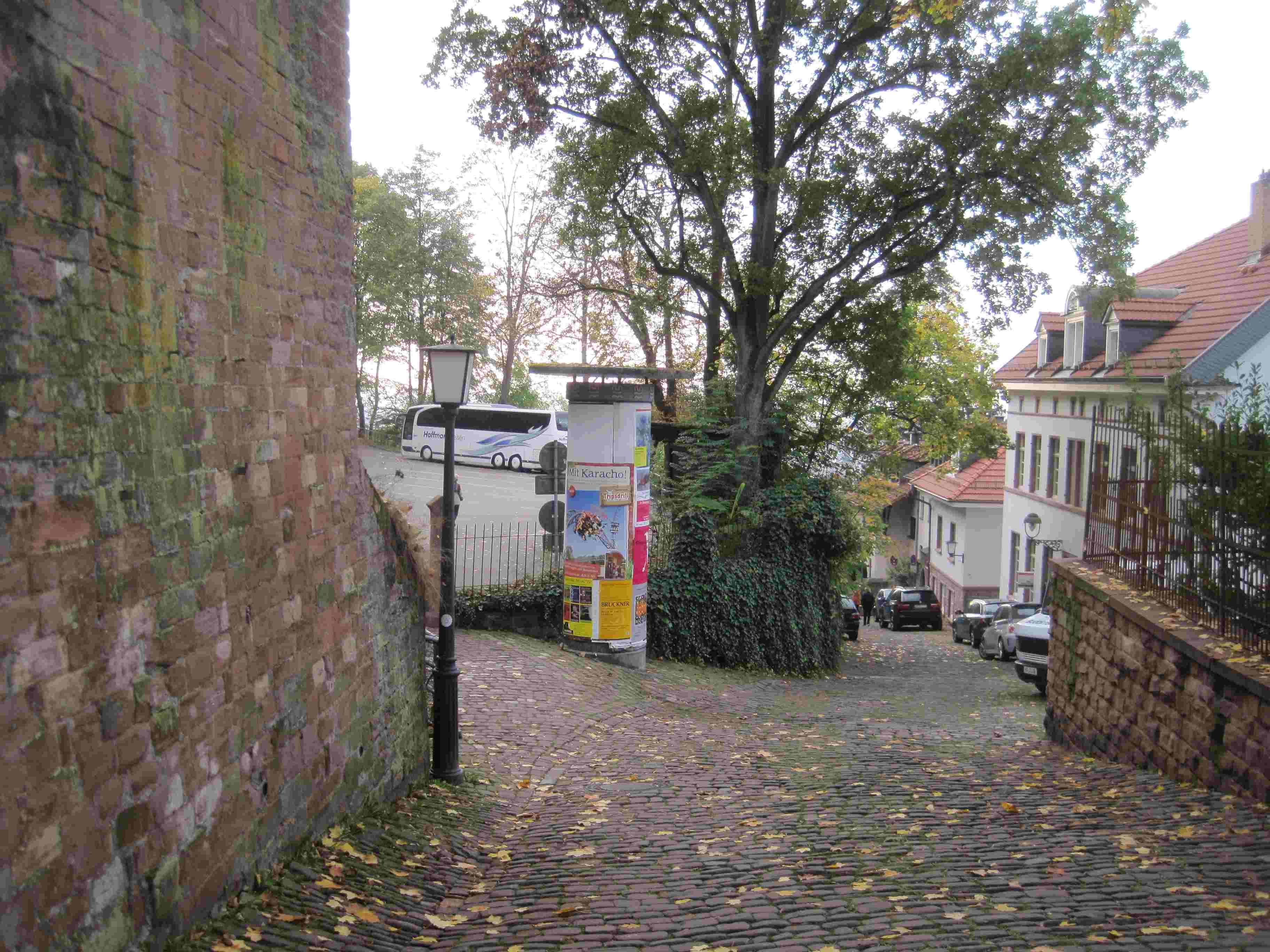 Neue Schloßstraße (Altstadt-Schloßberg) Serpentinenweg von der Bremeneckgasse zum Schloß (Fortsetzung: Schloß-Wolfsbrunnen-Weg), 1873-1875 als Fahrstraße zur Entlastung des Schloßberg angelegt. Verbindungshäuser, Villen im Burgen- und Fachwerkstil, Hangstützmauerm.