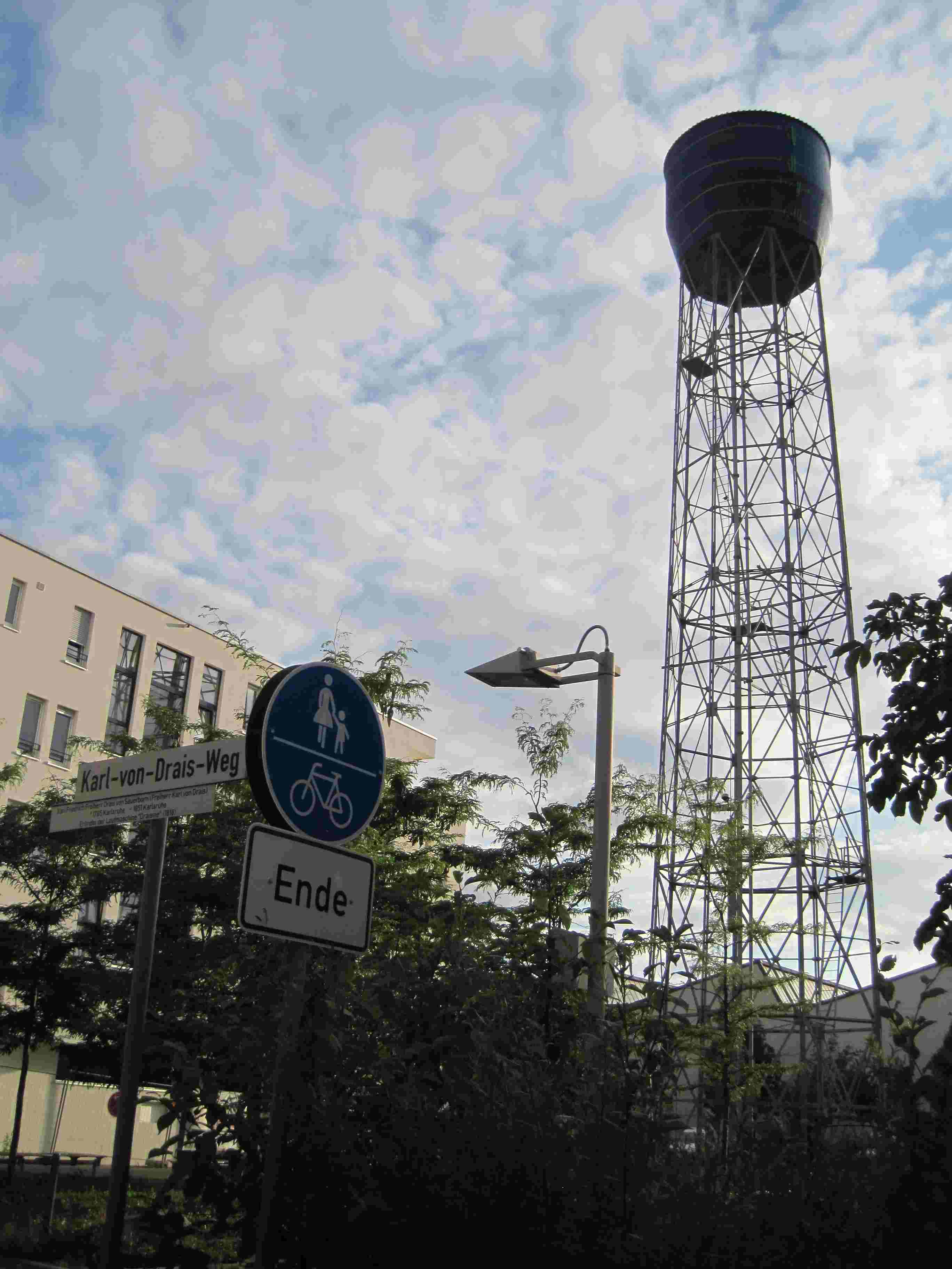 Wasserturm am Czernyring (1907 für die Badische Staatseisenbahn in Eisenbeton-Skelettbauweise errichtet. Wassertank 500 cbm umfassend)