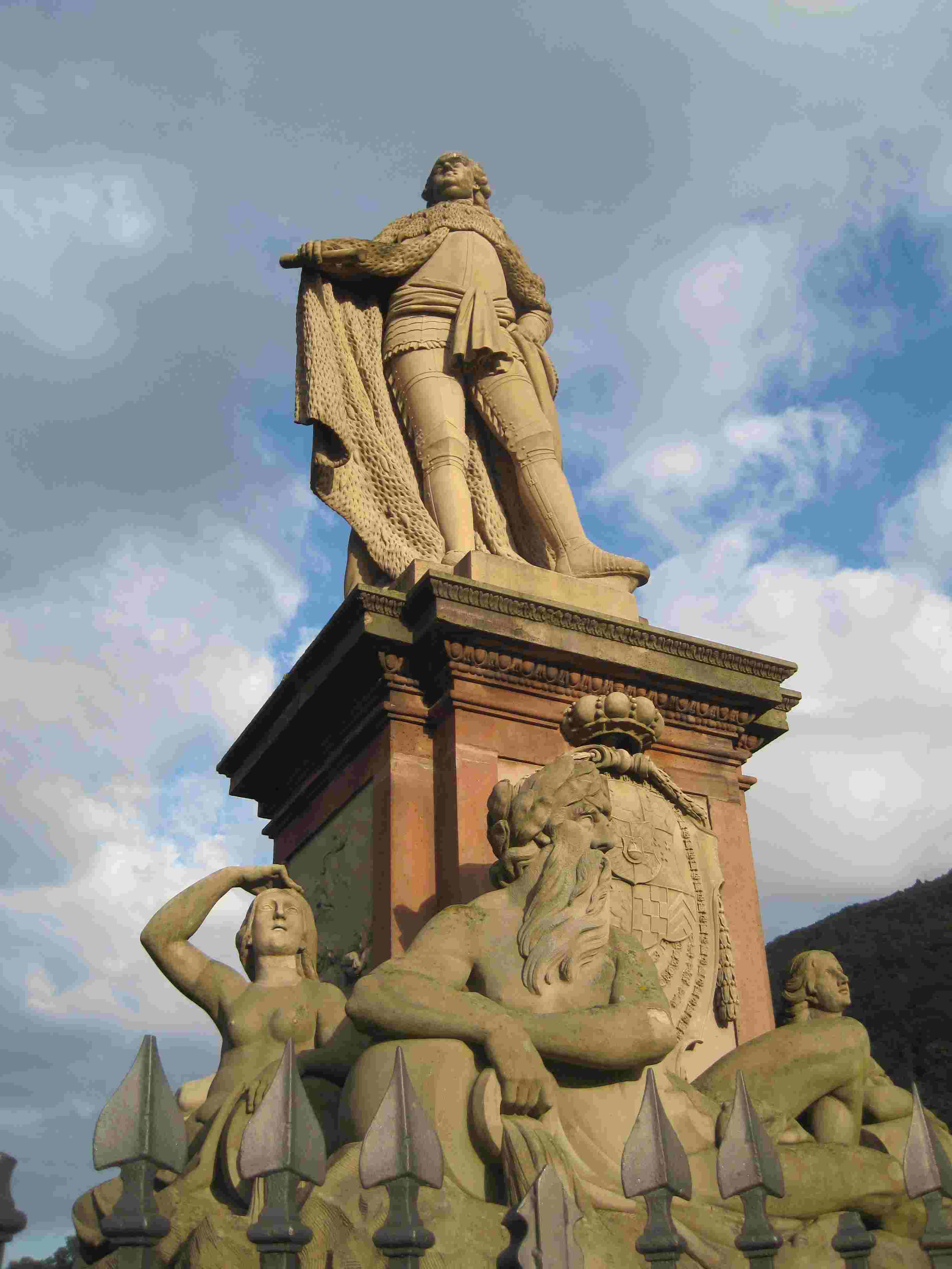 9. April 1788: das Standbild des Kurfürsten Carl Theodor, umgeben von den Sinnbildern der pfalzbayerischen Flüssen Rhein, Donau, Mosel, Maas, geschaffen von Hofbildhauer Konrad Linck, wird auf der Heidelberger Neckarbrücke errichtet