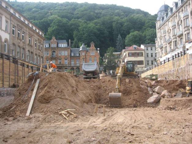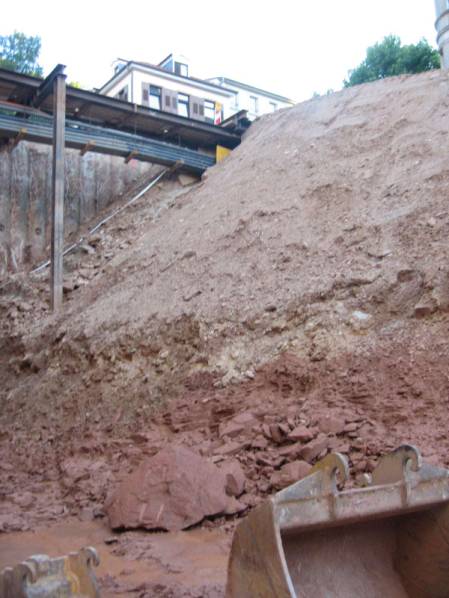 Nach etwa 8 m, also im unteren Drittel des Kieses. stellte sich das vorher bereits in diesem Niveau erbohrte Grundwasser ein. Dieses Wasser, das an der Baustelle jetzt abgepumpt wird, speiste früher einmal die zahlreichen Altstadtbrunnen. Der stauende Horizont, hier der anstehende Buntsandstein, weiter östlich in der Kernaltstadt der Granit, stellte sich 2-3 m tiefer ein bei ca. 102 m, wie ebenfalls in den Bohruntersuchungen vorab schon fixiert ist