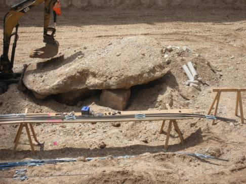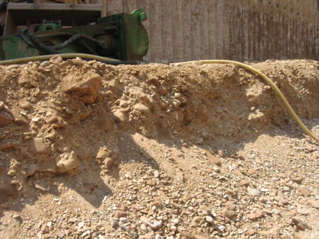 Abb. 1: Im Vordergrund lauter Kies, links der Baggerschaufel Schwemmlöss, darüber vom Bagger künstlich umgeschichtetes Material. Rechts Buntsandstein-Blöcke aus dem Kies.
