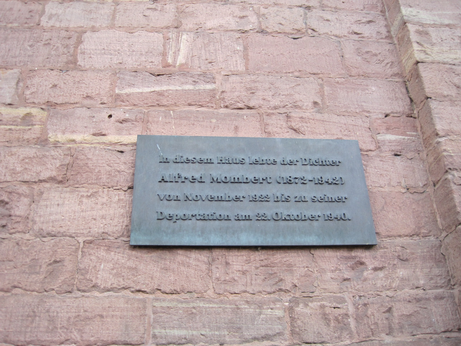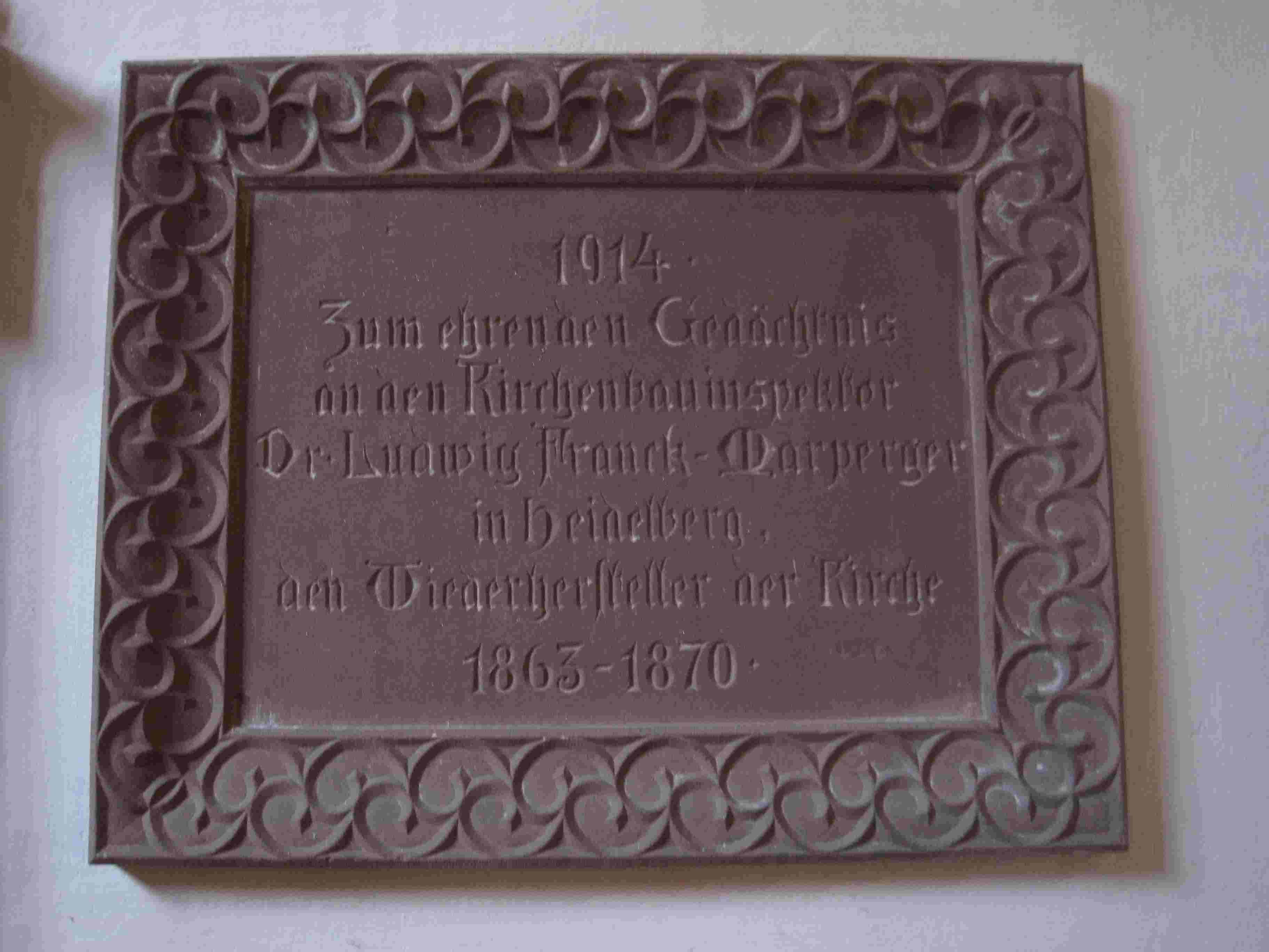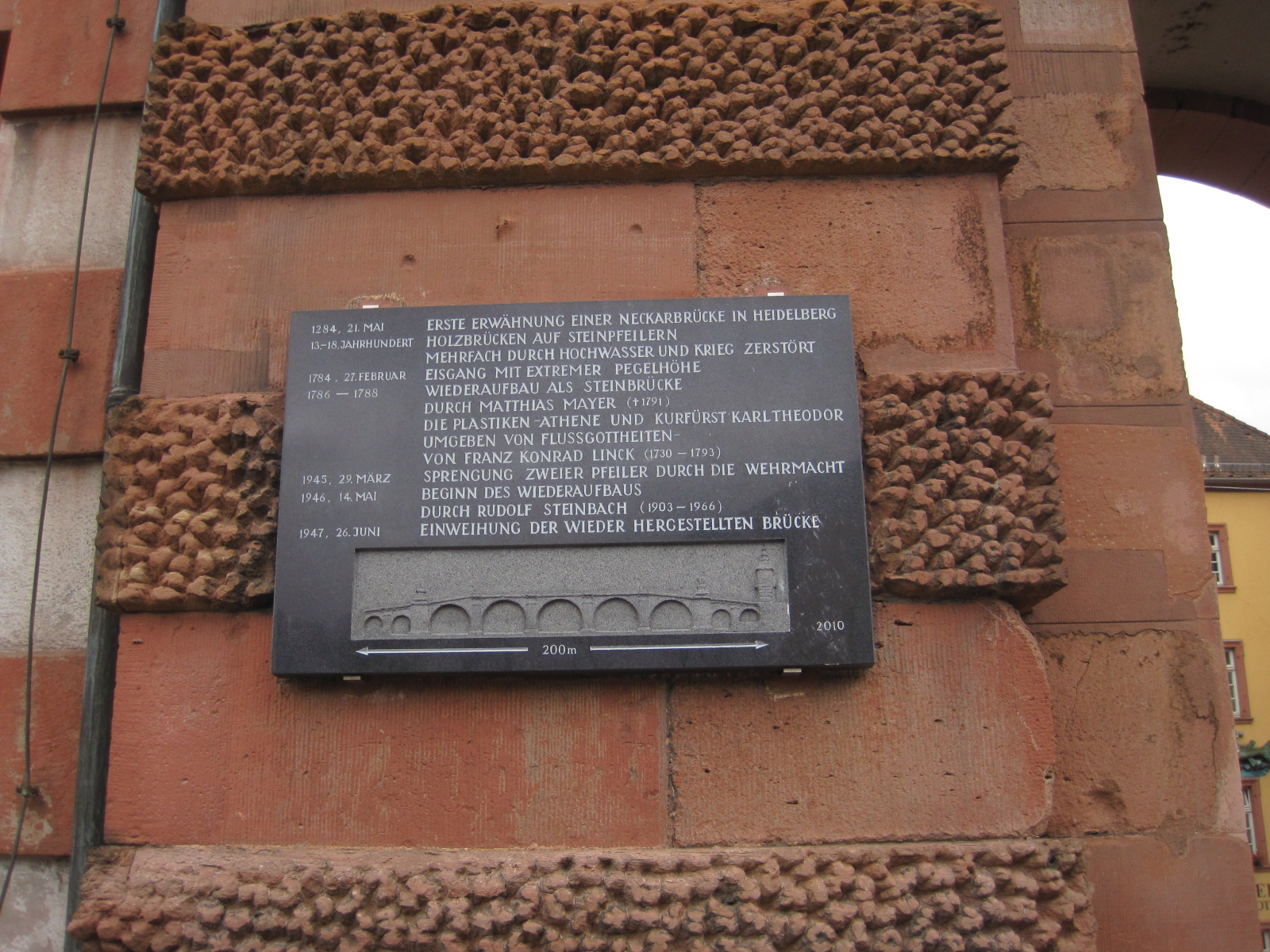 Dem Andenken des Freundes / und Wohlthäter der Stadt Heidelberg / Dr. med. Hermann Kleinschmidt / geb. in Heidelberg 1816 gest. daselbst 1869 / welcher durch letzten Willen sein Vermögen / in Verbesserung und Verschönerung seiner Vaterstadt / schenkte, worauf dasselbe in den Jahren 1872-1875 / durch Beschluß des Stadtraths zur Herstellung dieses Schloßwegs verwendet wurde / gewidmet diese Tafel die dankbare Bürgerschaft 1876.