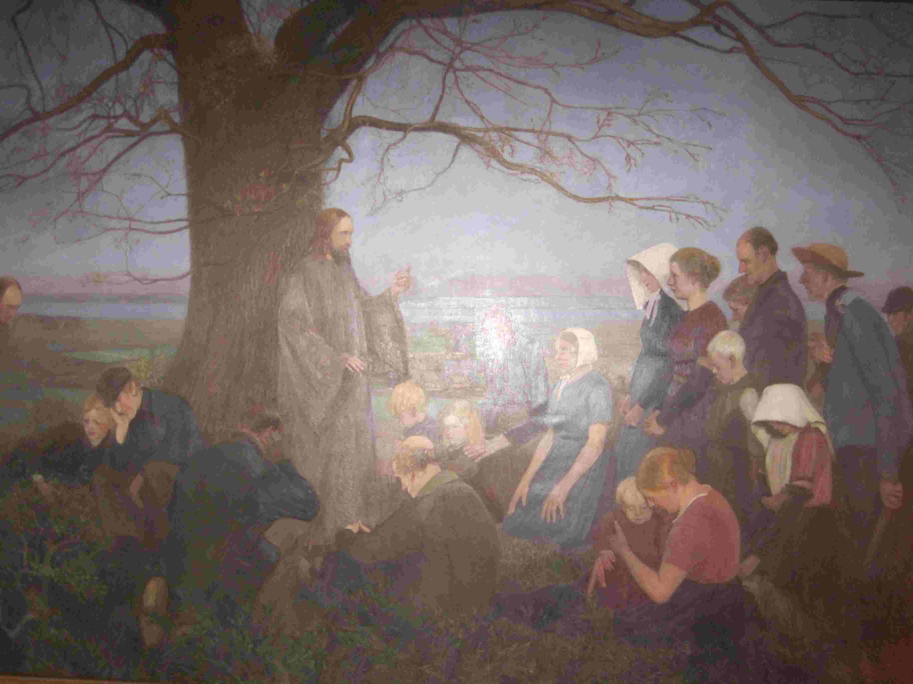 1911: Leinwandgemälde “Bergpredigt” von Fritz Mackensen (1866-1953) Das Monumentalgemälde „Bergpredigt“ (1911) des Worpsweder Malers Fritz Mackensen hat seinen Platz auf der Nordseite der Empore der Peterskirche. Es hing bis 1953 in der Universitätsbibliothek, danach in der Universitätskapelle.