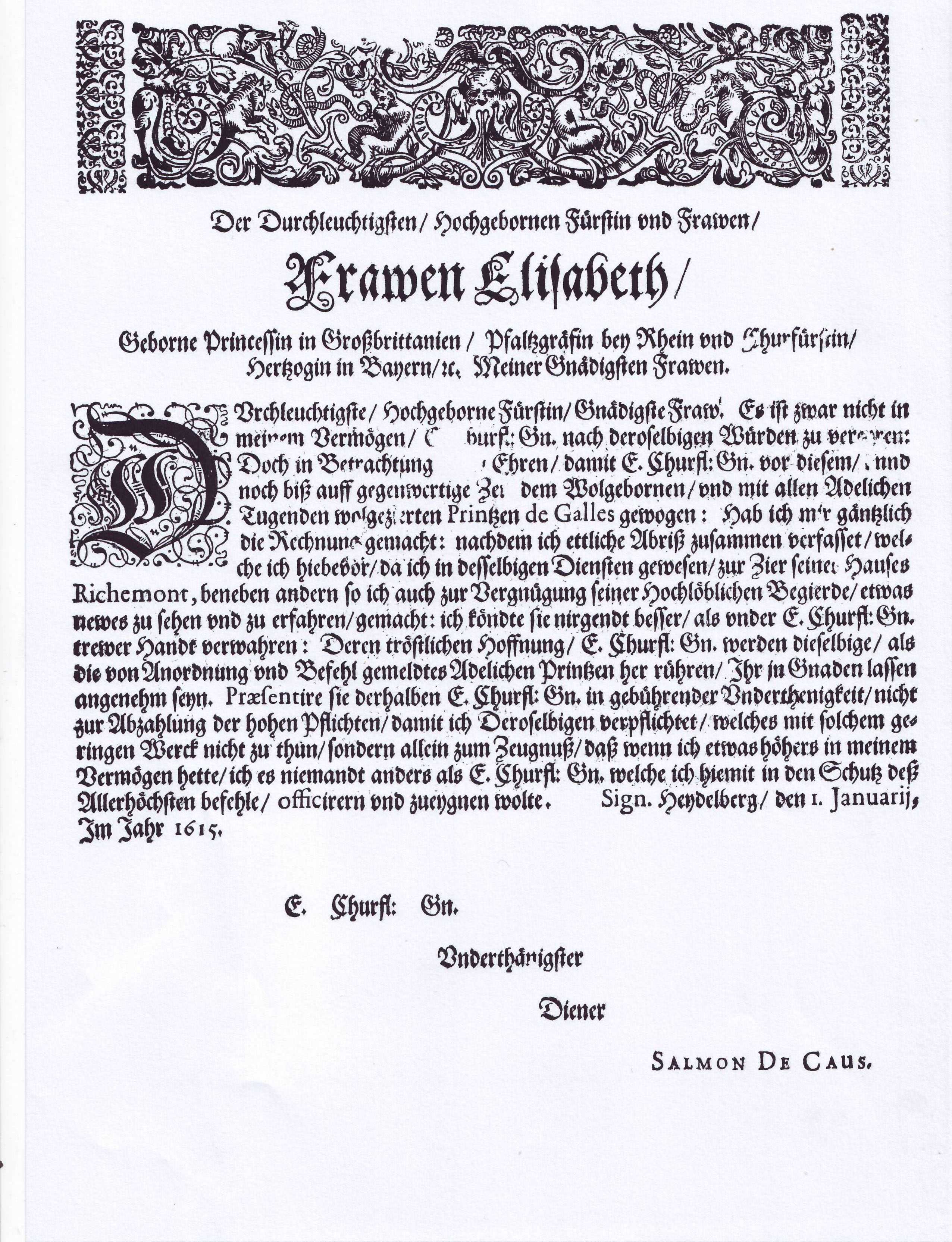 Anstellungsvertrag von Salomon de Caus (1614) (abgedruckt in: Mittheilungen zur Geschichte des Heidelberger Schlosses. Hg. vom Heidelberger Schloßverein. Heidelberg 1.1885/86 (1886))