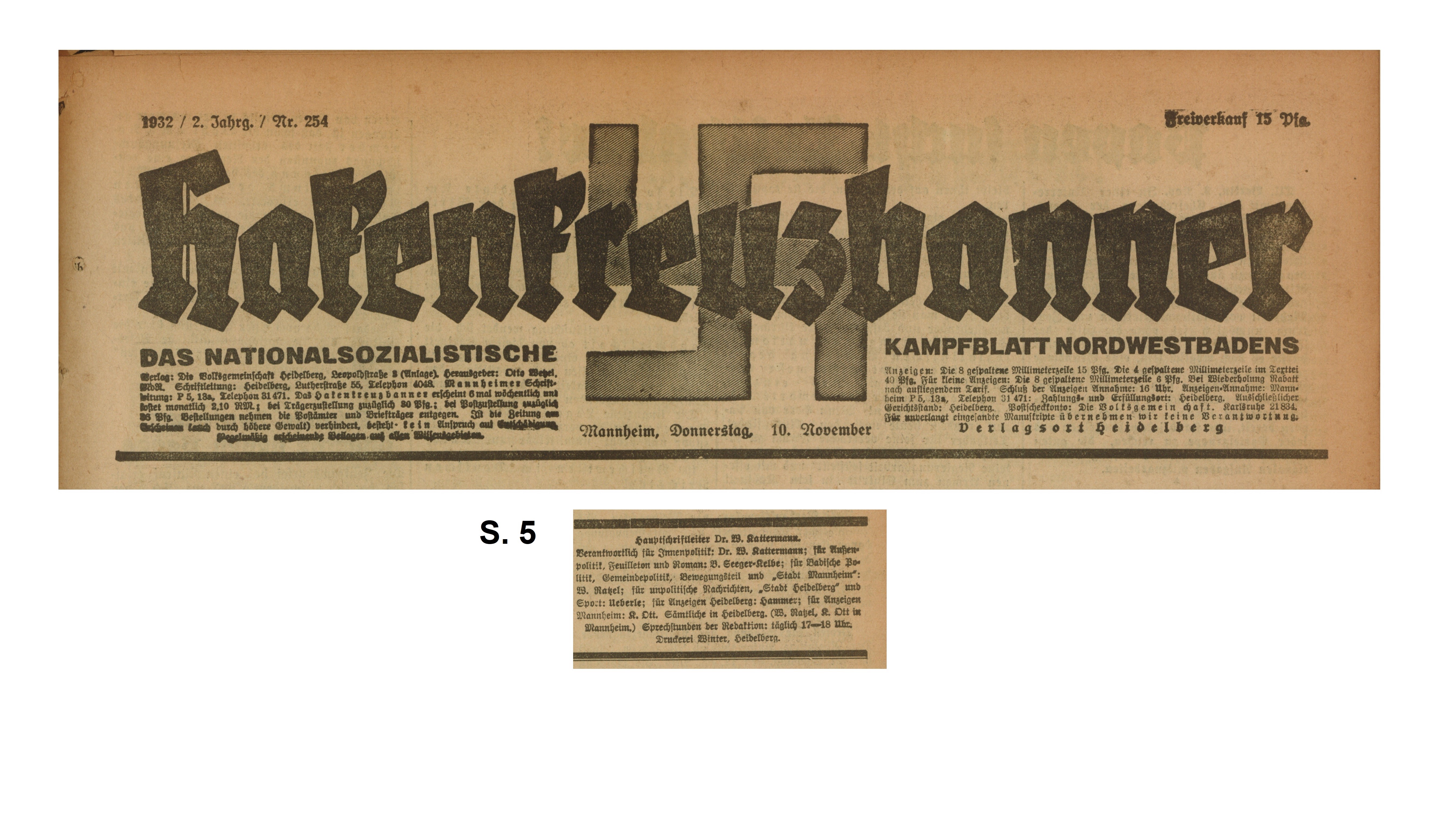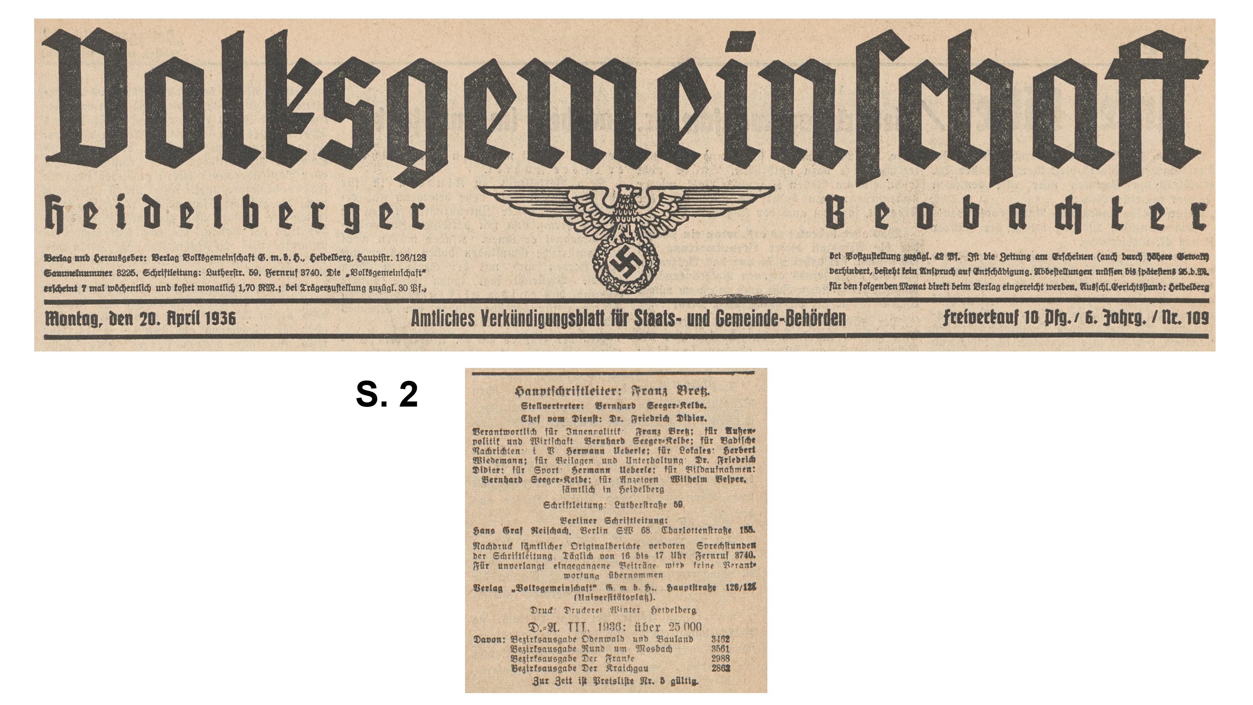 4.) Die Volksgemeinschaft. Kampfblatt der Nationalsozialisten für Franken, Odenwald und Bauland. Amtliches Verkündungs-Organ für Staats- und Gemeinde-Behörden. [Untertitel:] Heidelberger Beobachter. Verlegt von der Volksgemeinschaft G.m.b.H., Hauptstraße 126/128; Hauptschriftleiter: Franz Bretz. Schriftleitung: Brunnengasse 20/24. Am 1. März 1932 ändert die am 3. Januar 1931 erstmals erschienene Zeitung "Heidelberger Beobachter" ihren Titel in "Die Volksgemeinschaft / Heidelberger Beobachter". Nach Adreßbuch 1942 befindet sich Verlag und Schriftleitung der "Volksgemeinschaft" GmbH im Pressehaus, Sophienstraße 9. Ab 1. April 1939 ist Karl Maria Hageneier Hauptschriftleiter. Ab 1. September 1944 ist die Volksgemeinschaft die einzige Tageszeitung in Heidelberg. Ab 1. Oktober 1944 ist Hermann Bagusche Hauptschriftleiter. Die letzte Ausgabe erscheint am 29. März 1945. - Der im Stadtarchiv Heidelberg vorhandene Bestand enthält nur die Mosbacher Ausgabe.