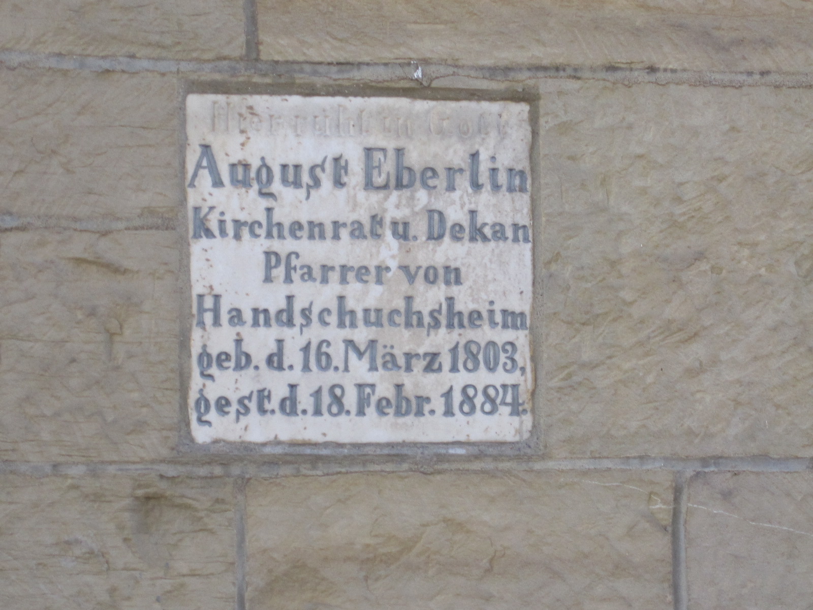 August Eberlin, Zur Erinnerung an Kirchenrat August Christian Eberlin: Lic. Theol. Dekan und Pfarrer zu Handschuchsheim gestorben am 18. Februar 1884; eine biographische Skizze nebst den bei seiner Beerdigung gehaltenen Reden. Schopfheim i. W. (Uehlin) 1885 [Mays (Brosch.) 17,78 RES]