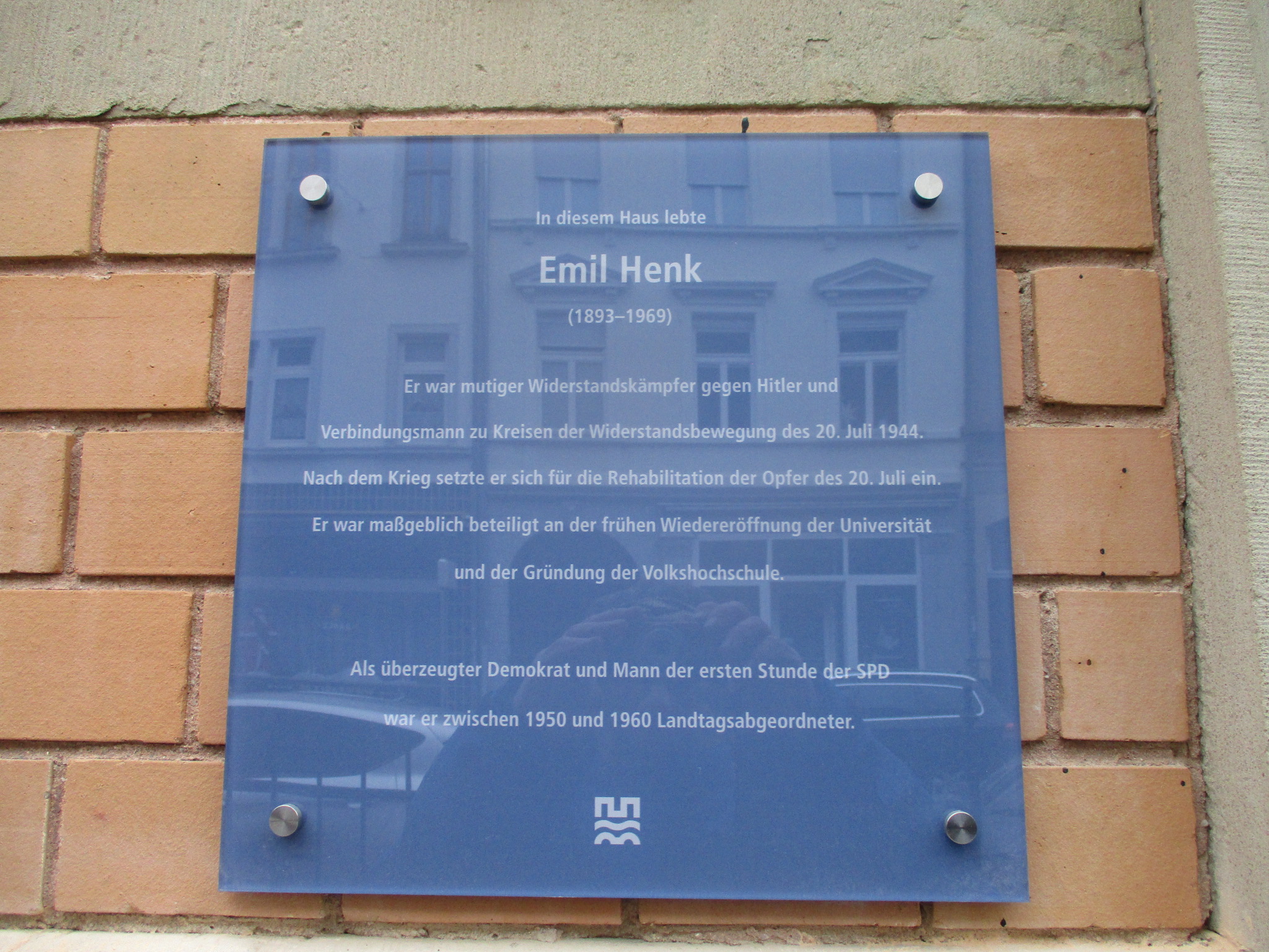 Dezember 2021: Anbringung einer Gedenktafel am Haus Kaiserstraße 33 („In diesem Haus lebte Emil Henk / 1893-1969 / Er war mutiger Widerstandskämpfer gegen Hitler und Verbindungsmann zu Kreisen der Widerstandsbewegung des 20. Juli 1944. / Nach dem Krieg setzte er sich für die Rehabilitation der Opfer des 20. Juli ein. / Er war maßgeblich beteiligt an der frühen Wiedereröffnung der Universität und der Gründung der Volkshochschule. / Als überzeugter Demokrat und Mann der ersten Stunde der SPD war er zwischen 1950 und 1960 Landtagsabgeordneter .“)