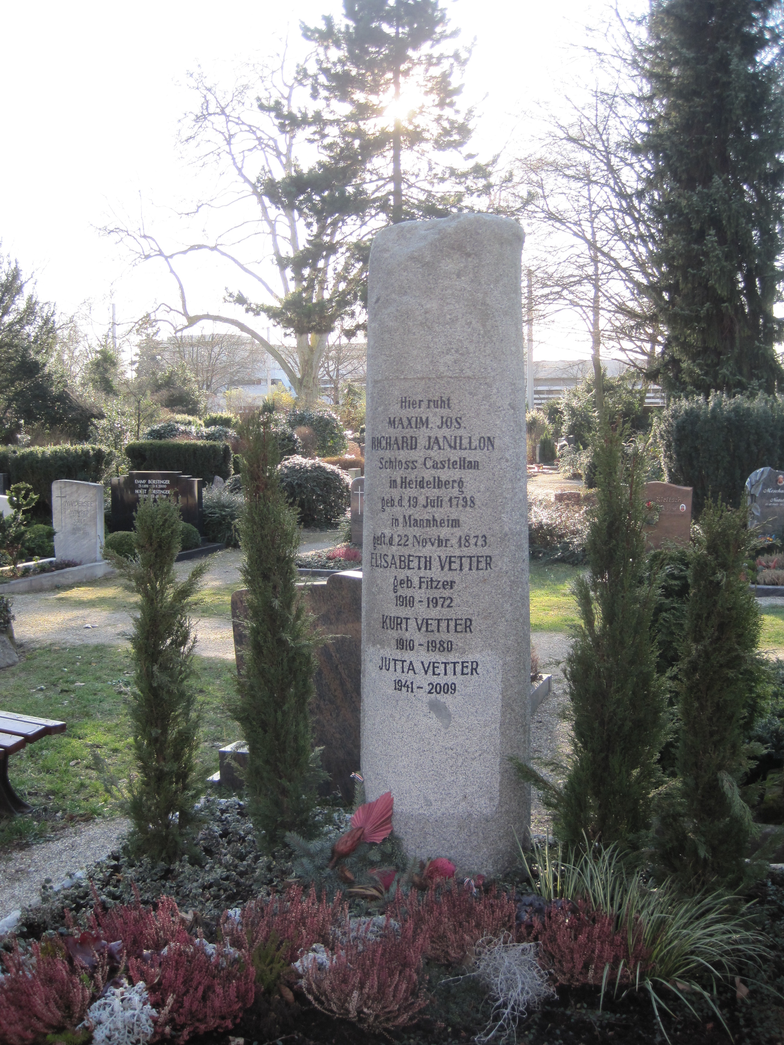 >Inschrift auf einer Grabsäule im Bergfriedhof: "Hier ruht Maxim. Jos. Richard Janillon Schloss-Castellan in Heidelberg geb. d. 19. Juli 1798 in Mannheim gestorben d. 22. Novbr. 1873" (weitere Namen: Vetter, Hofmann, Weiss))