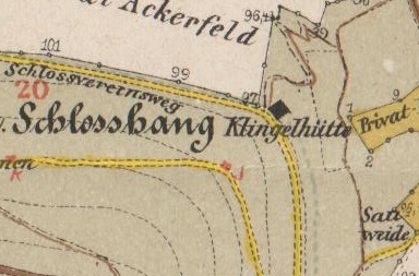 >Klingelhütte (Schlierbach, Schutzhütte am Schloßvereinsweg bzw. oberhalb der Graf-Johannes-Schanze auf dem oberen Wolfsbrunnenweg, 262 Meter über NN, am 31. März 1894 benannt, nach 1971 zerstört, vgl. Derwein 1940, Nr. 453)
