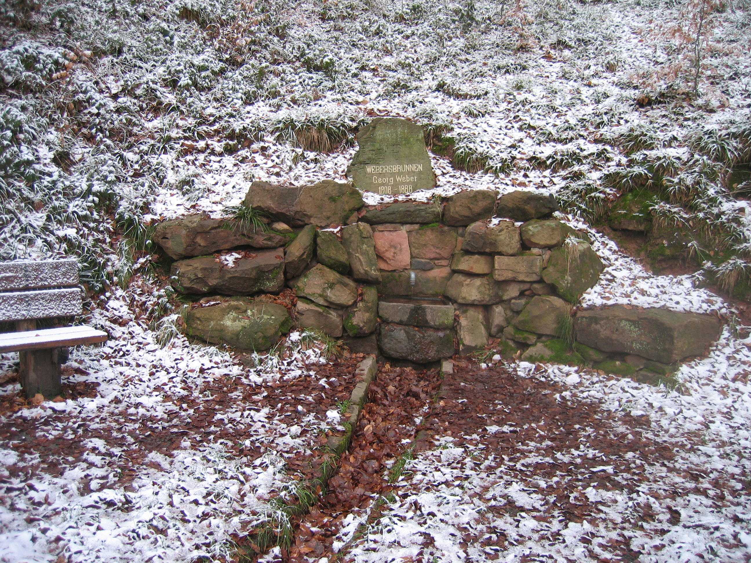 >Webersbrunnen (Stadtwald Neuenheim, an der Küblerschen Wiese); Inschrift: „Georg Weber 1808-1888“. N. B.: Der „Webersbrunnen“ hat seinen Namen ursprünglich nicht von Georg Weber bekommen, sondern von seinem ältesten Sohn Heinrich Weber. Dr. phil. Friedrich Percy Weber (1844-1895 in Berlin), Redakteur und Schriftsteller, hatte einem gemeinnützigen Verein (welchem?) durch letztwillige Verfügung 300 Mark vermacht. Am 7. Februar 1896 beschloss derselbe Verein den Betrag der Weberschen Stiftung zur Fassung der an der Küblerschen Wiese befindlichen Quelle in Form einer Steinwand zu verwenden, die Quelle dicht an die Fahrstraße zu leiten, mit einer Ruhebank zu versehen und die ganze Anlage alsdann zu Ehren des Stifters „Webersbrunnen“ zu benennen. In der Generalversammlung am 3. März 1896 wurde der Beschluss des Ausschusses des gemeinnützigen Vereins vom 7. Februar noch dahin erweitert, dass der Name „Webersbrunnen“ zugleich auch noch ein Andenken und eine Ehrung des Vaters des Stifters der 300 Mark, Georg Weber, sein solle. Daher steht auf dem Sandstein zusätzlich „Georg Weber 1808-1888“. (freundliche Mitteilung von Dr. Franz Werner, 2012)