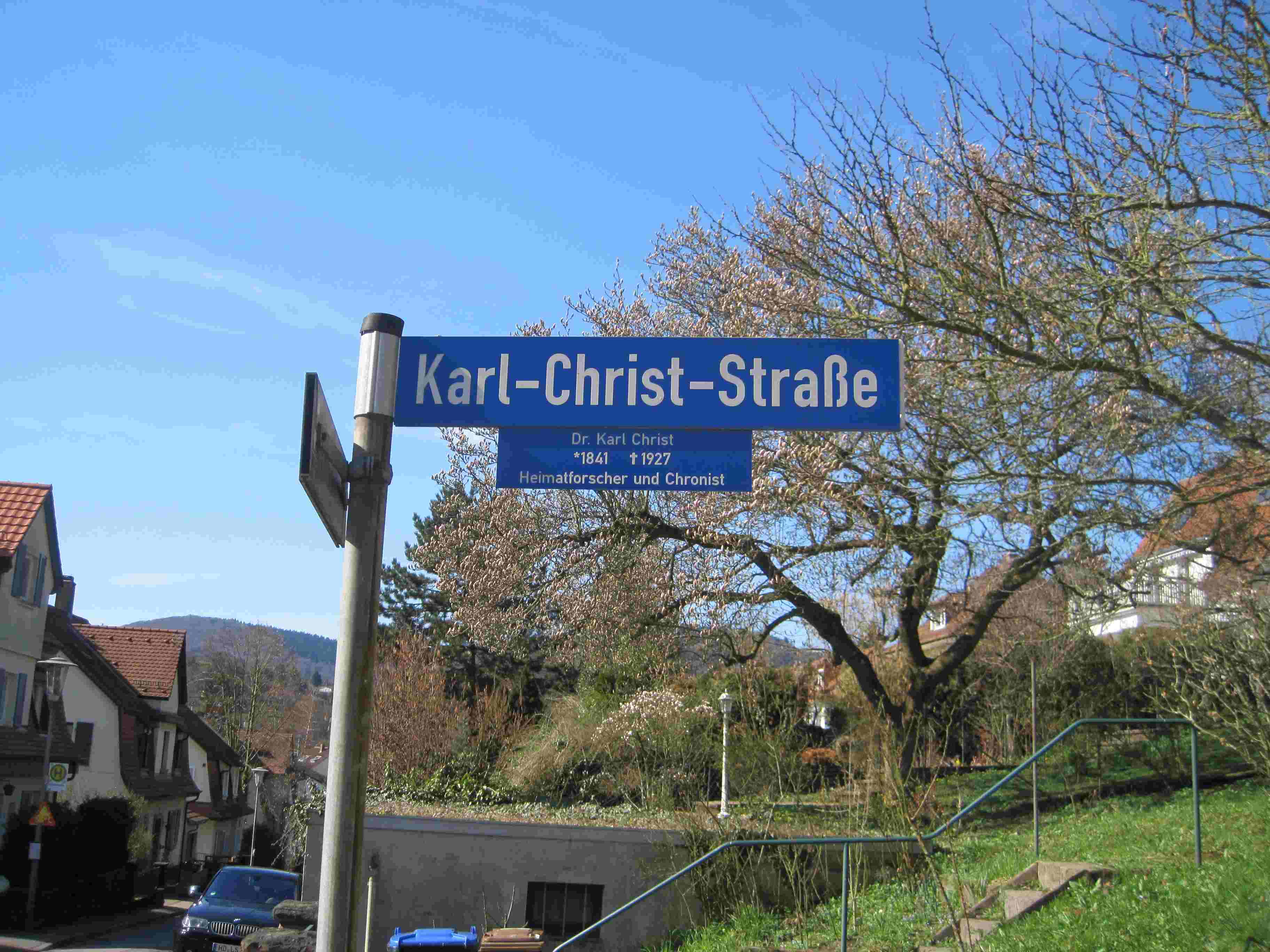 >Die Straße in Ziegelhausen, in der er im „Hahnberghof“ wohnte, heißt heute Karl-Christ-Straße