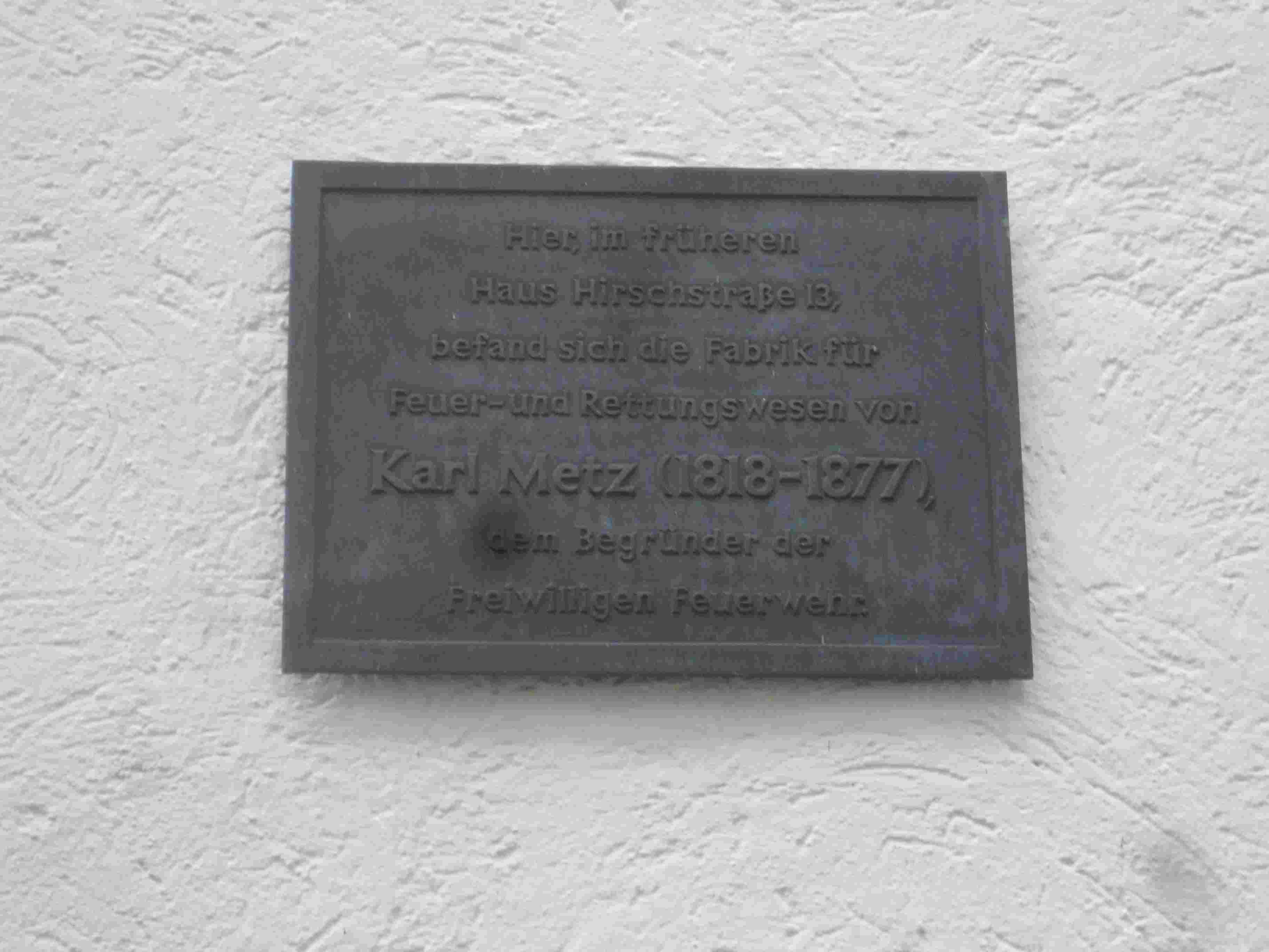 >Tafel an der Heiliggeiststraße 11: „Hier im früheren / Haus Hirschstraße 13, / befand sich die Fabrik für / Feuer- und Rettungswesen / von Karl Metz (1818-1877), / dem Begründer der / Freiwilligen Feuerwehr“ (1985)