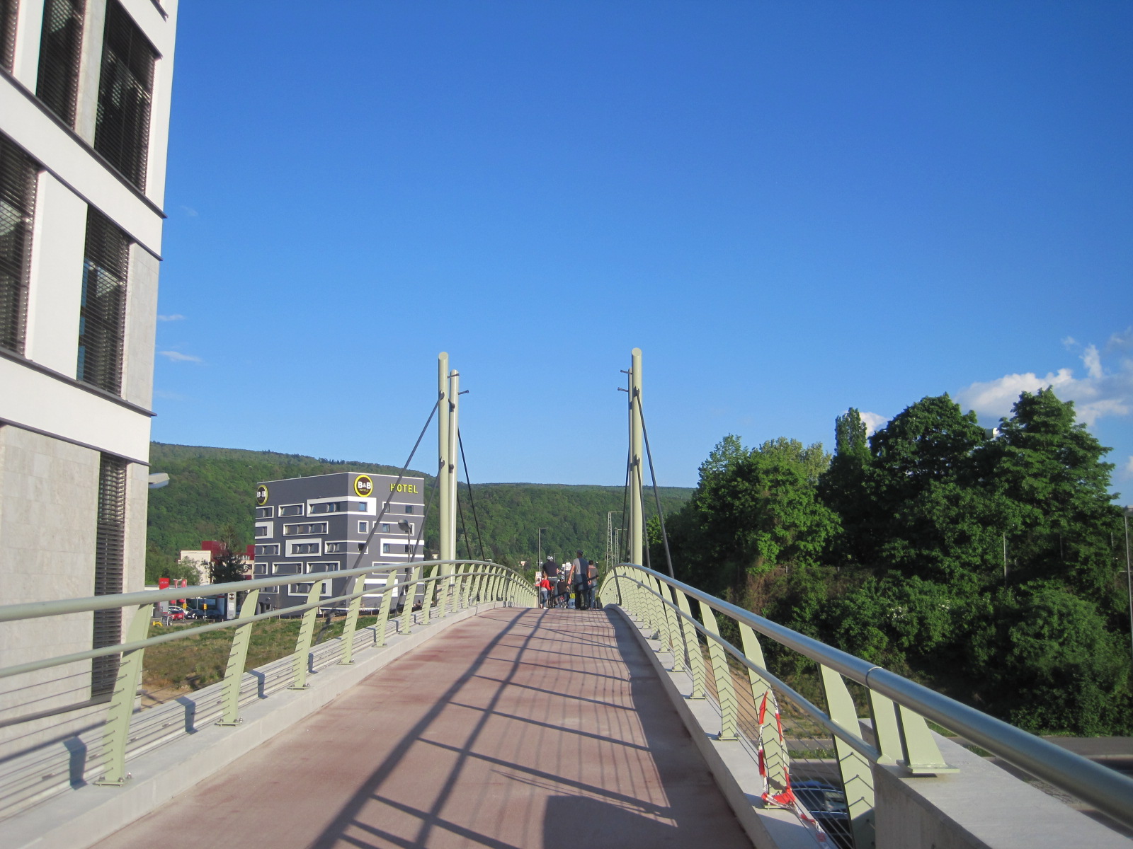 16. Mai 2025: der Valerieweg-Steg über die Neckartal-Bahnstrecke beim Bahnhof Altstadt (Karlstor) für Fußgänger (Gesamtkosten: zwei Millionen Euro) wird für die Öffentlichkeit freigegeben