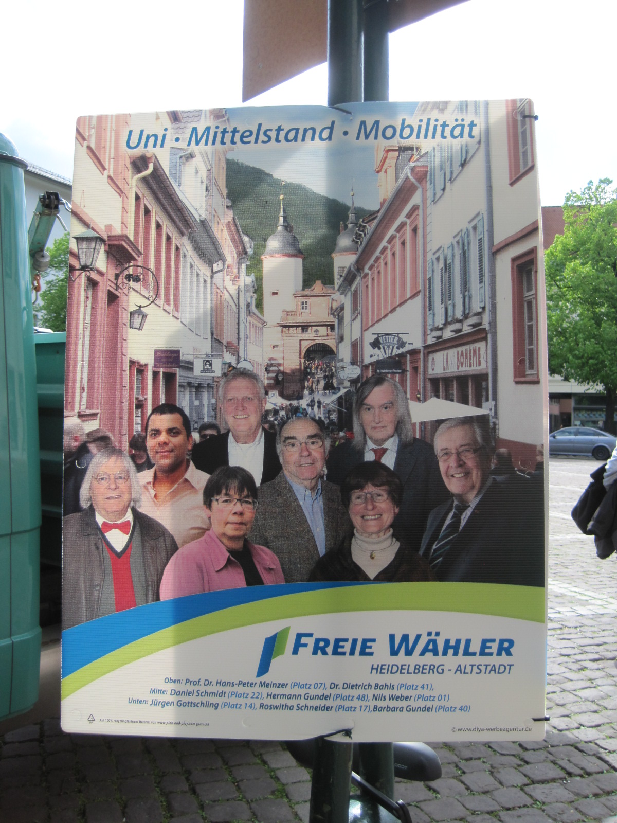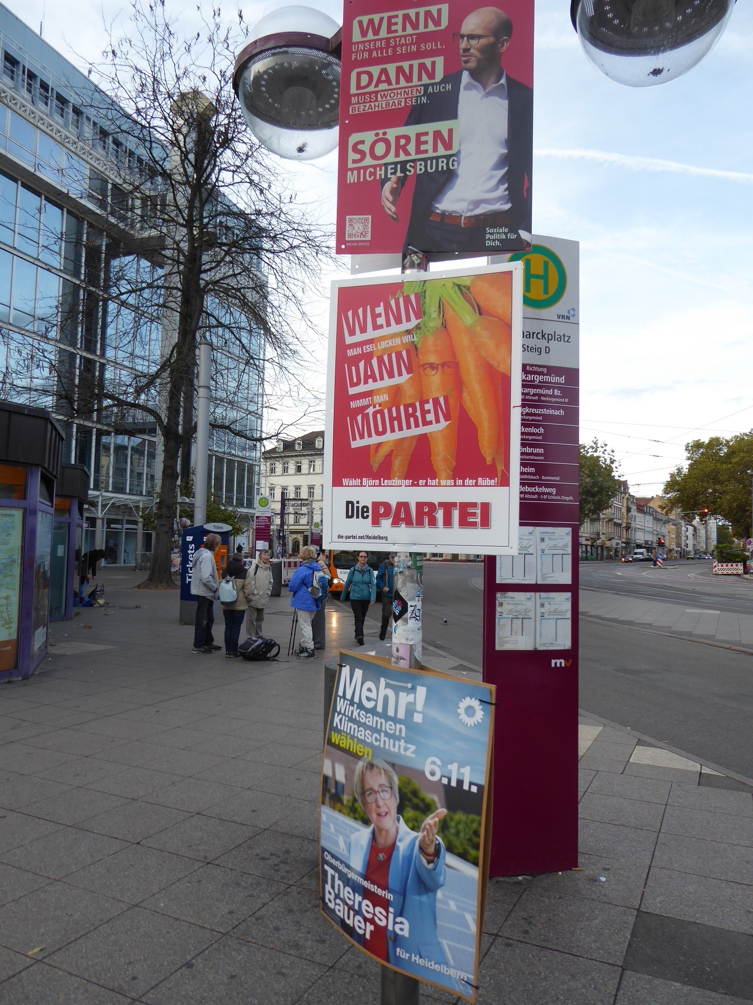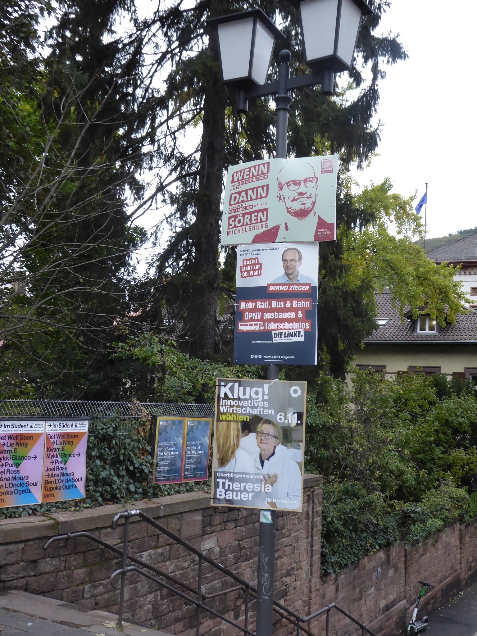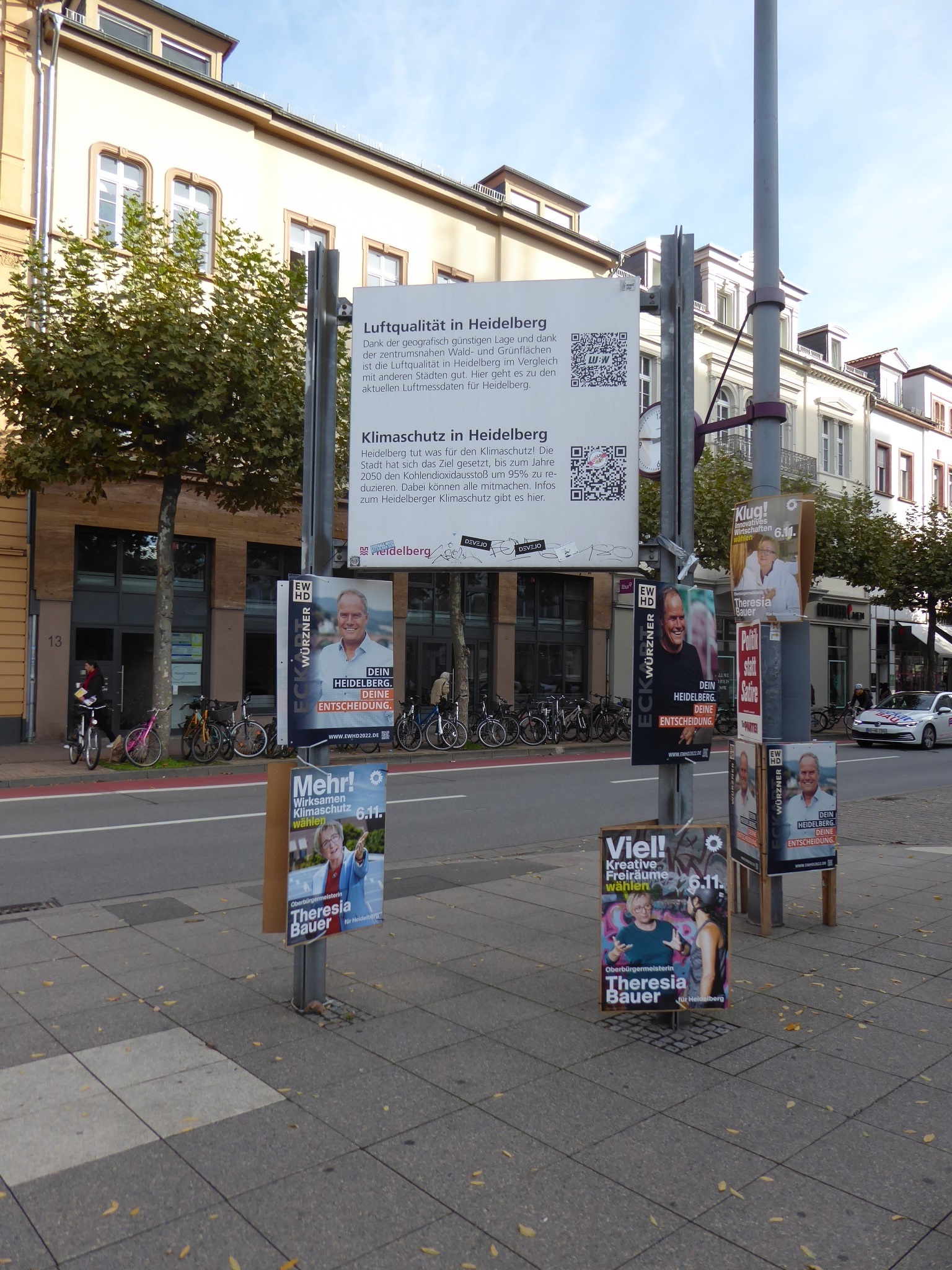 9. Juni 2024: Kommunalwahl in Heidelberg, parallel dazu Wahl des Europäischen Parlaments. Ergebnisse der Gemeinderatswahl: Grüne 26,4%, CDU 14,6%, SPD 12,4%, Heidelberger 10,7%, Linke 5,1%, FDP 5%, AfD 5,5%, GAL 3,1%, Bunte Linke 2,1%, Die Partei 2,6%, HiB 3,2%, FWV 1,2%, IDA 1,8%, VOLT 5,8%, Leser Liste 0,4%.